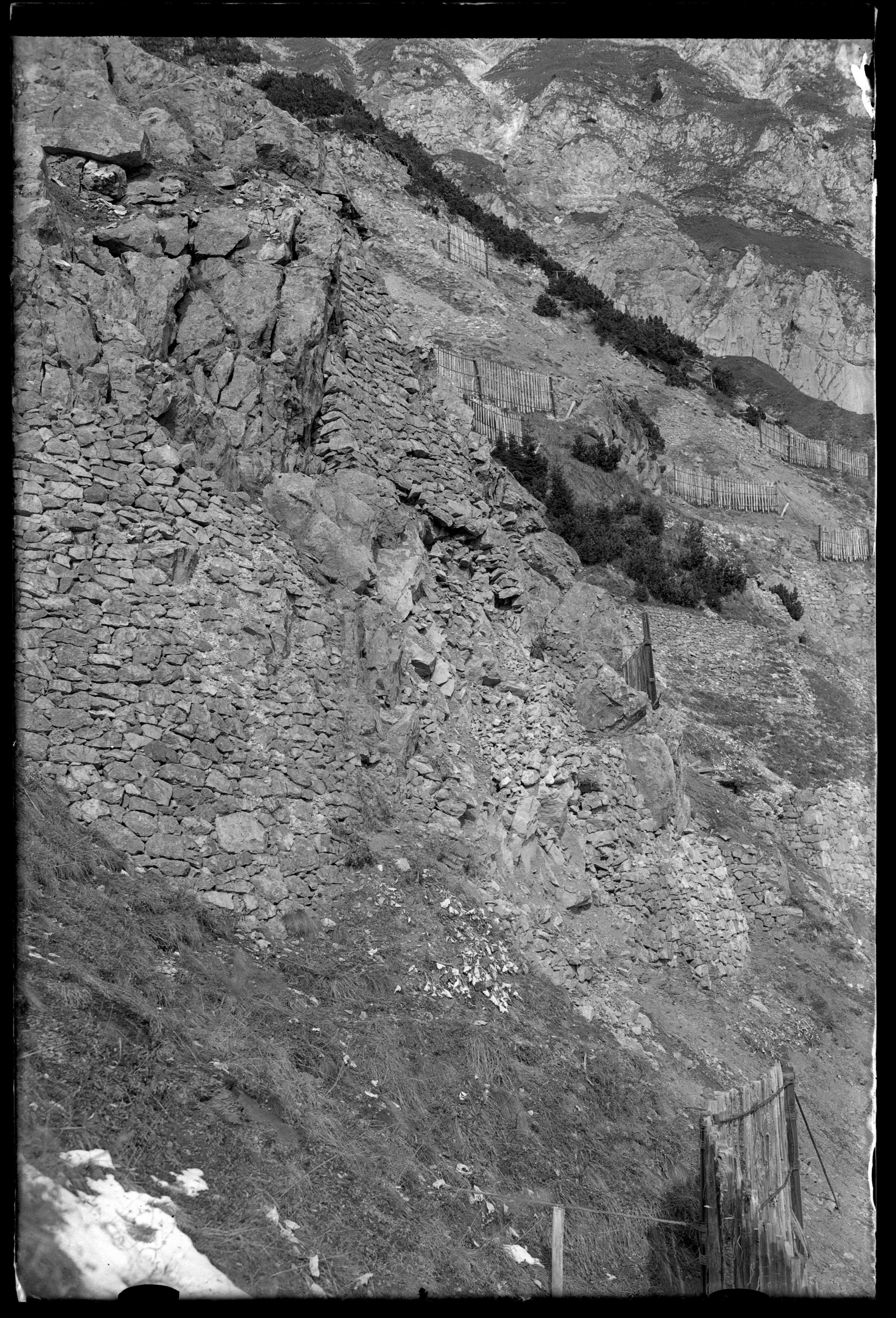 [Aufnahme von den Lawinenverbauungen (ausschließlich Arlberg-Schneerechen) oberhalb des Bahnhofs Langen am Arlberg [3]]
