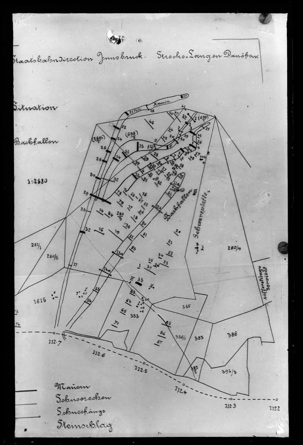 • In dem Plan sind sämtliche Mauern, Schneerechen und Schneefänge eingezeichnet. Angefertigt wurde dieser von der Staatsbahndirection Innsbruck. (Text: Michael Laublättner)