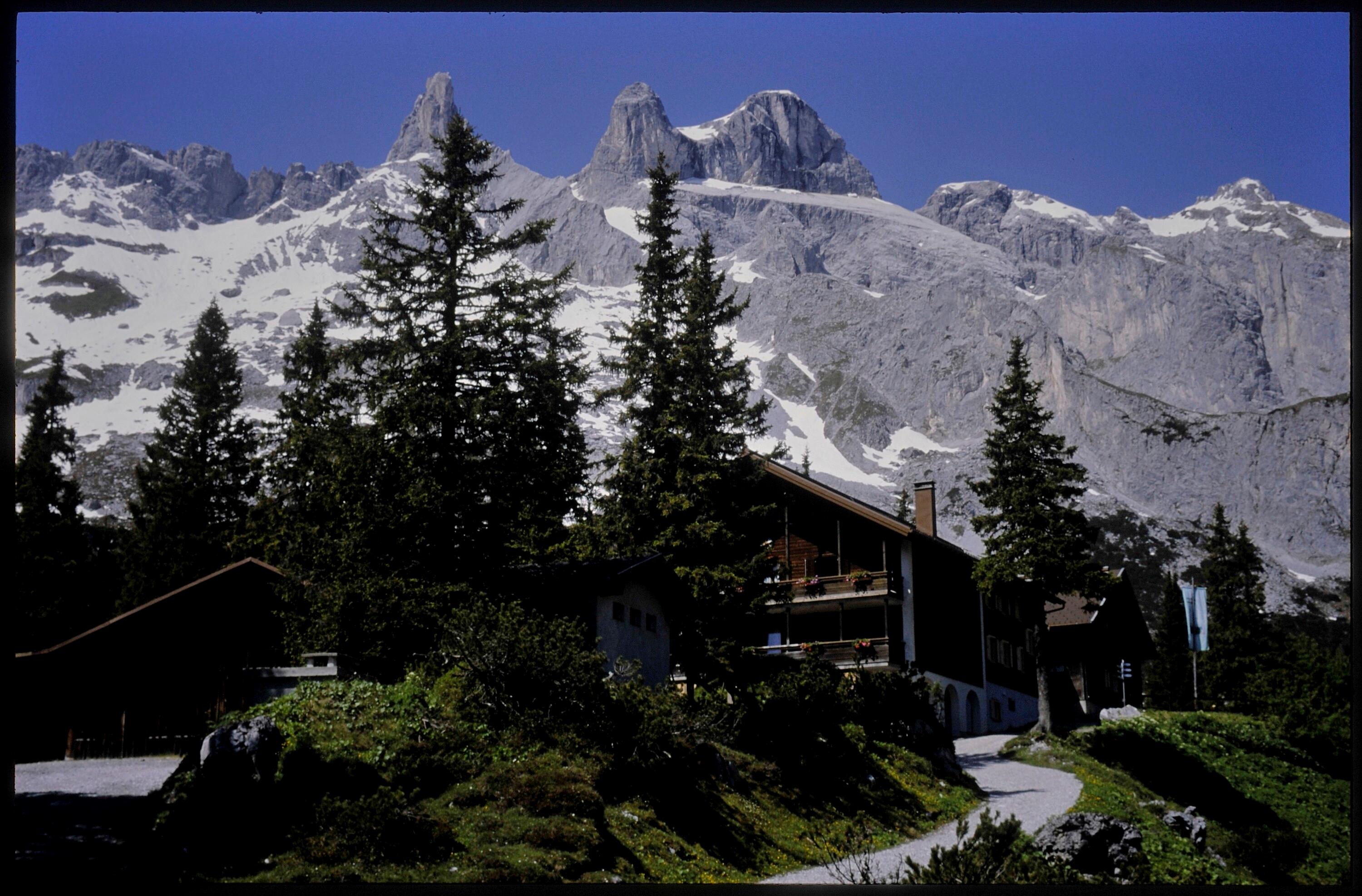 [Tschagguns] Lindauer-Hütte, 1764 m, mit den drei Türmen und Drusenfluh