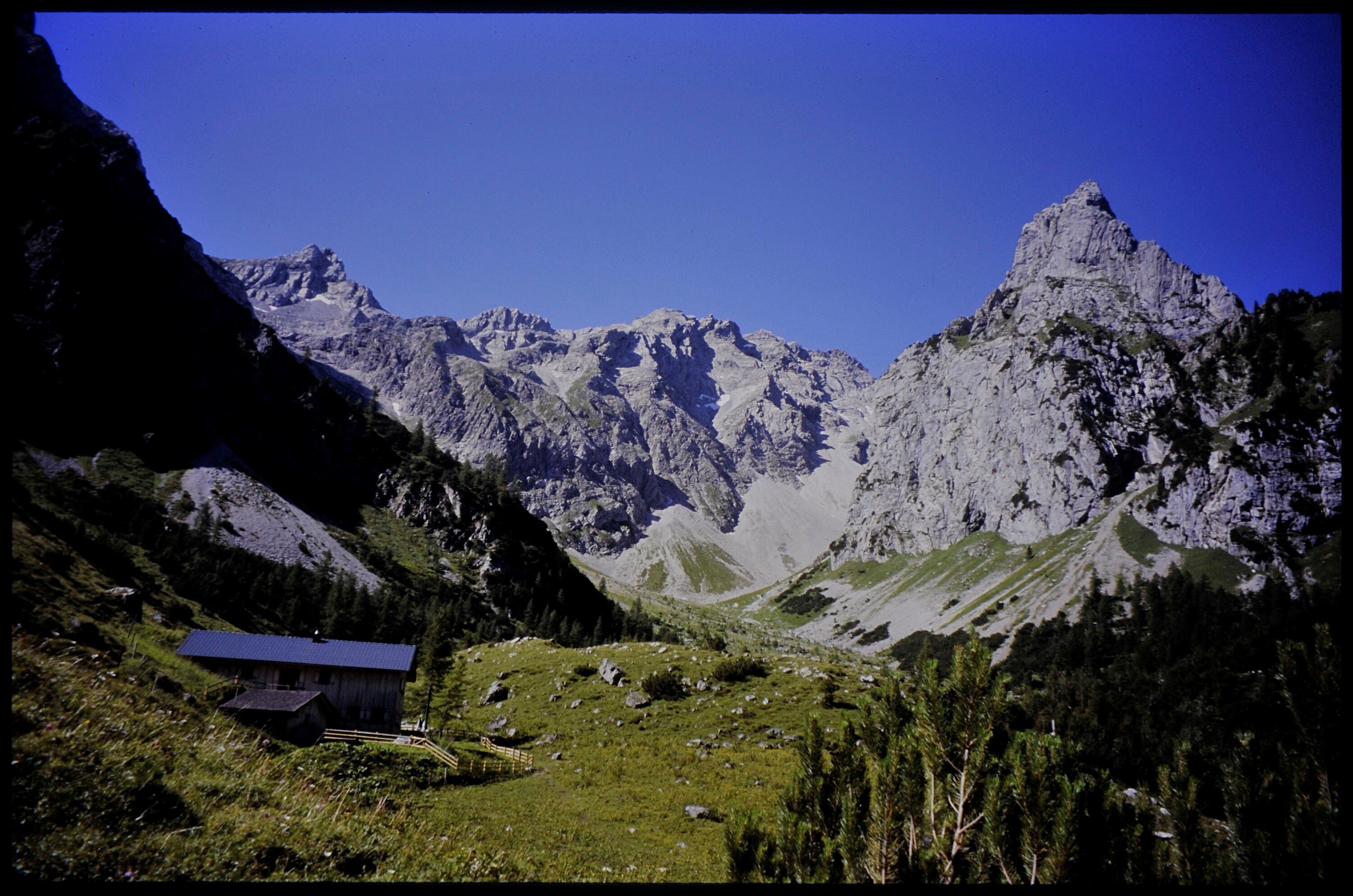 [Bürs] Sarotlahütte, 1611 m des ÖAV Rätikon - Vorarlberg : [Sarotlahütte des ÖAV, 1611 m, gegen Eisernes Törle, Zimba 2643 m und Hüttenstube, Rätikon Vorarlberg, Österreich ...]
