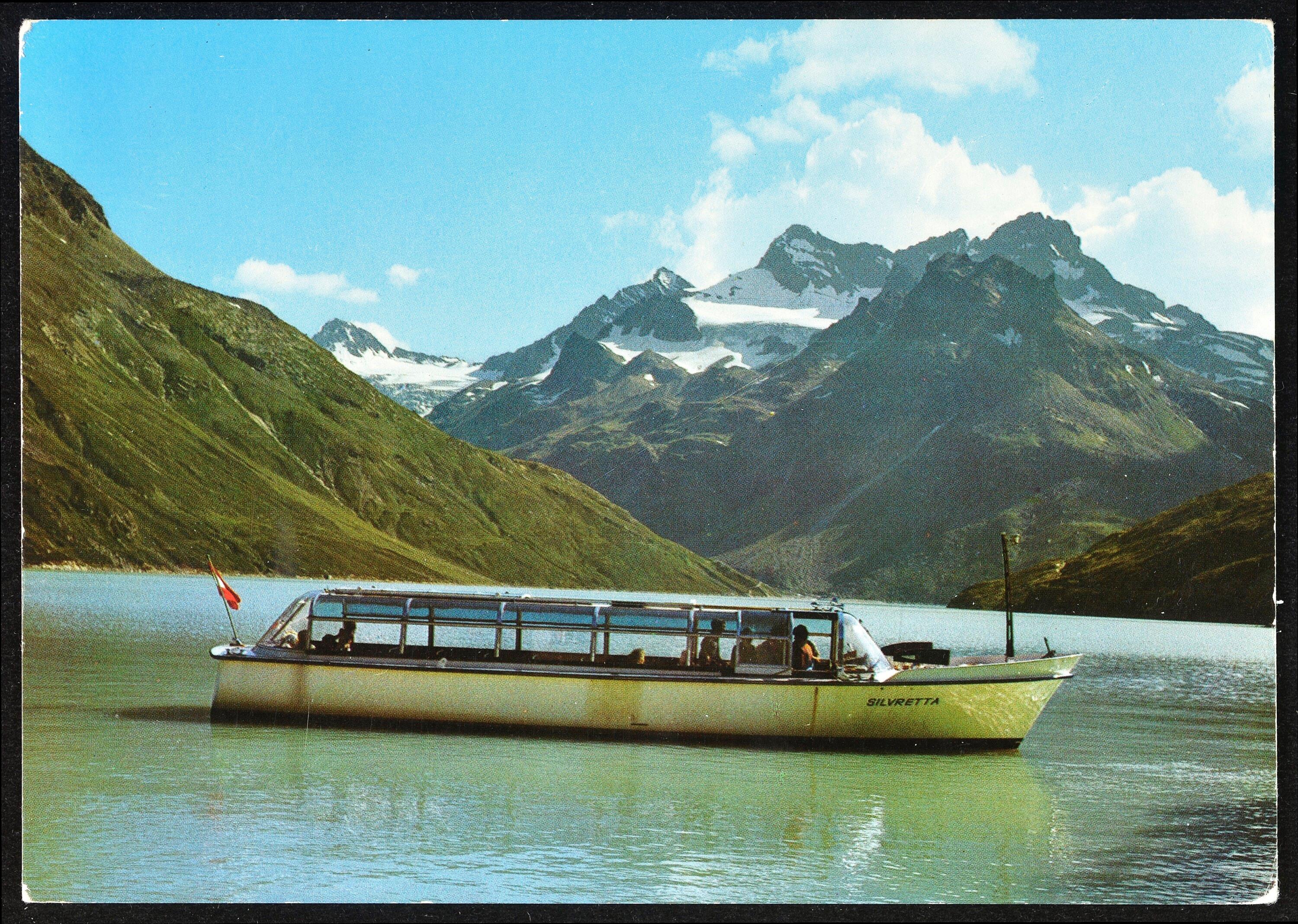 [Gaschurn] : [Silvrettasee, 2040 m, Motorboot "Silvretta", mit Piz Buin Gruppe und Hohem Rad, 2934 m. Österreich-Austria-Autriche ...]