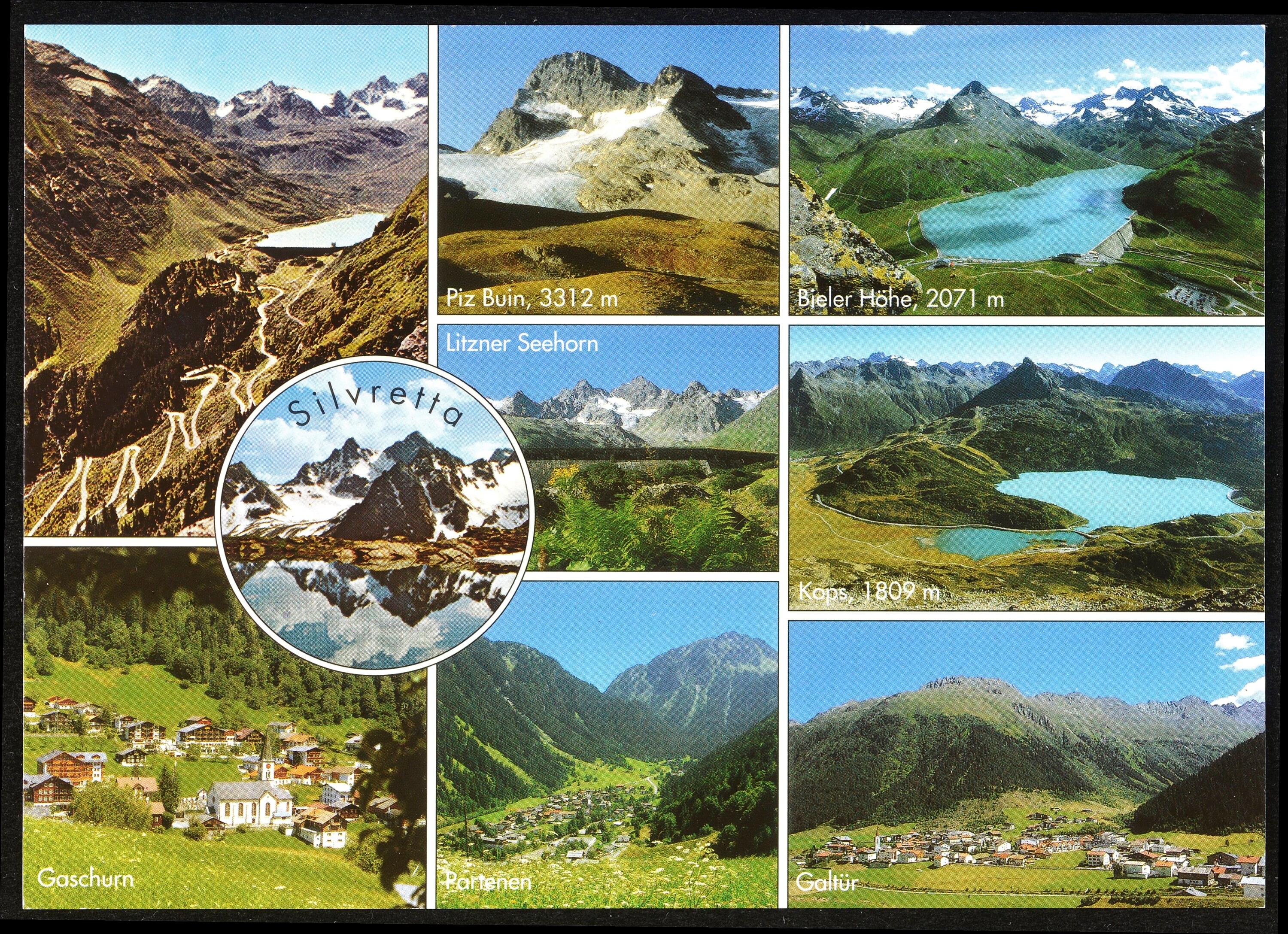 [Gaschurn Partenen] Grüsse aus der Silvretta : [links oben: Litznergruppe mit Seehorn, 3121 m links unten: Silvrettastausee Mitte: Silvretta - Hochalpenstraße rechts oben: Piz Buin, 3212 m rechts unten: Schrägaufzug Partenen ...]