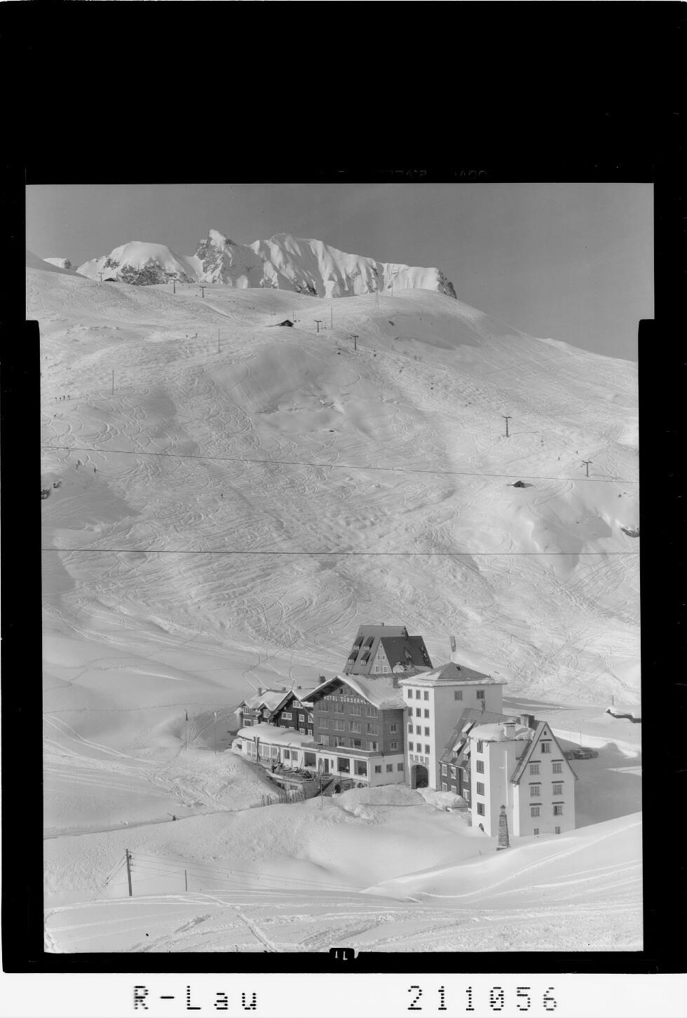 [Hotel Zürserhof bei Zürs am Arlberg gegen Mittagspitze und Omeshorn]