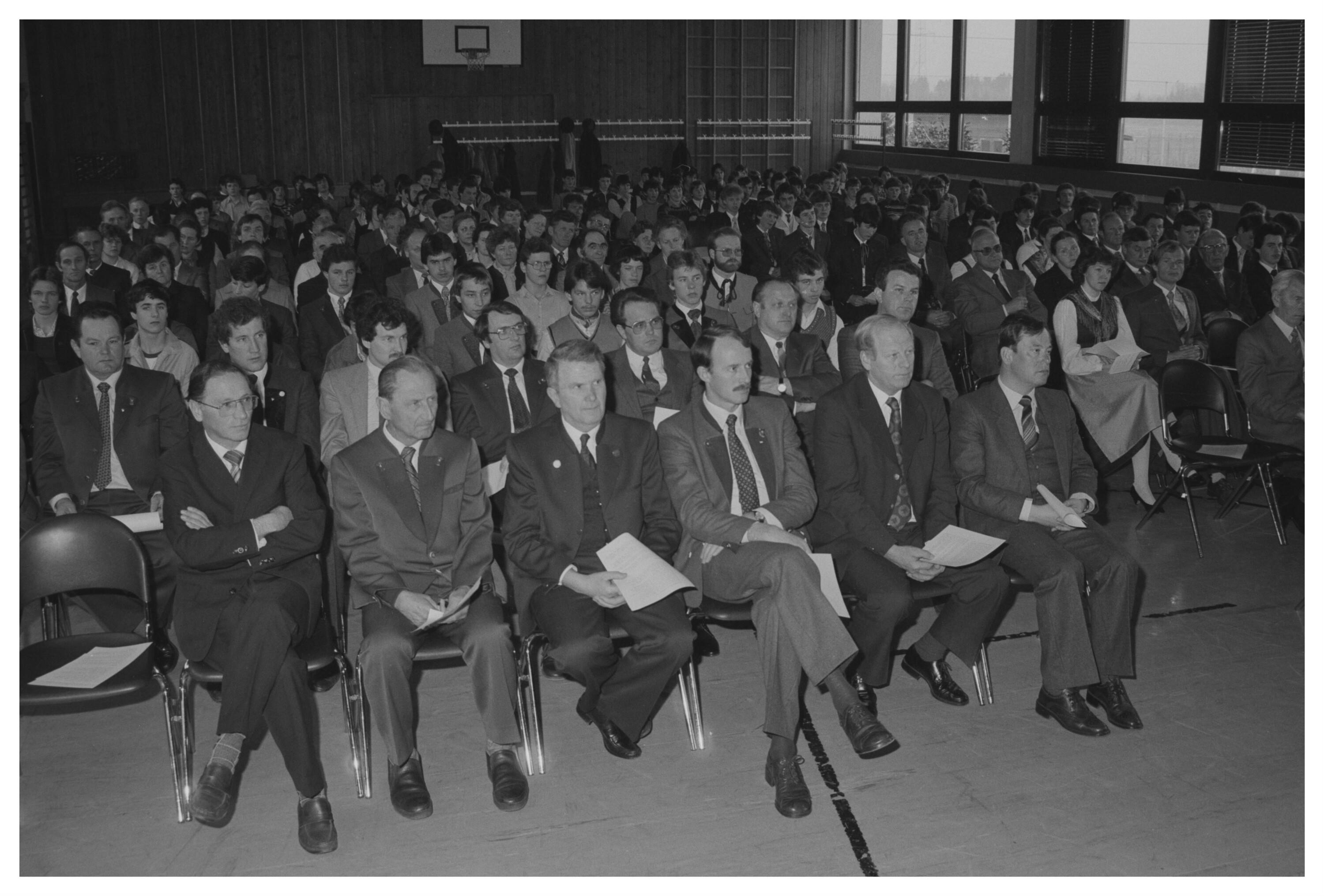 • o:159705 1. Reihe v.l.n.r.: Otto Amann, Erich Steger, unbekannt, unbekannt, unbekannt, Konrad Blank, Siegfried Gasser; am Rednerpult: Herbert Fill
