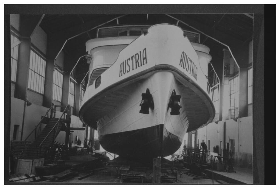 MS OSTMARK (ab 1945 AUSTRIA) bei der Montage im Trockendock in Bregenz im Sommer 1939