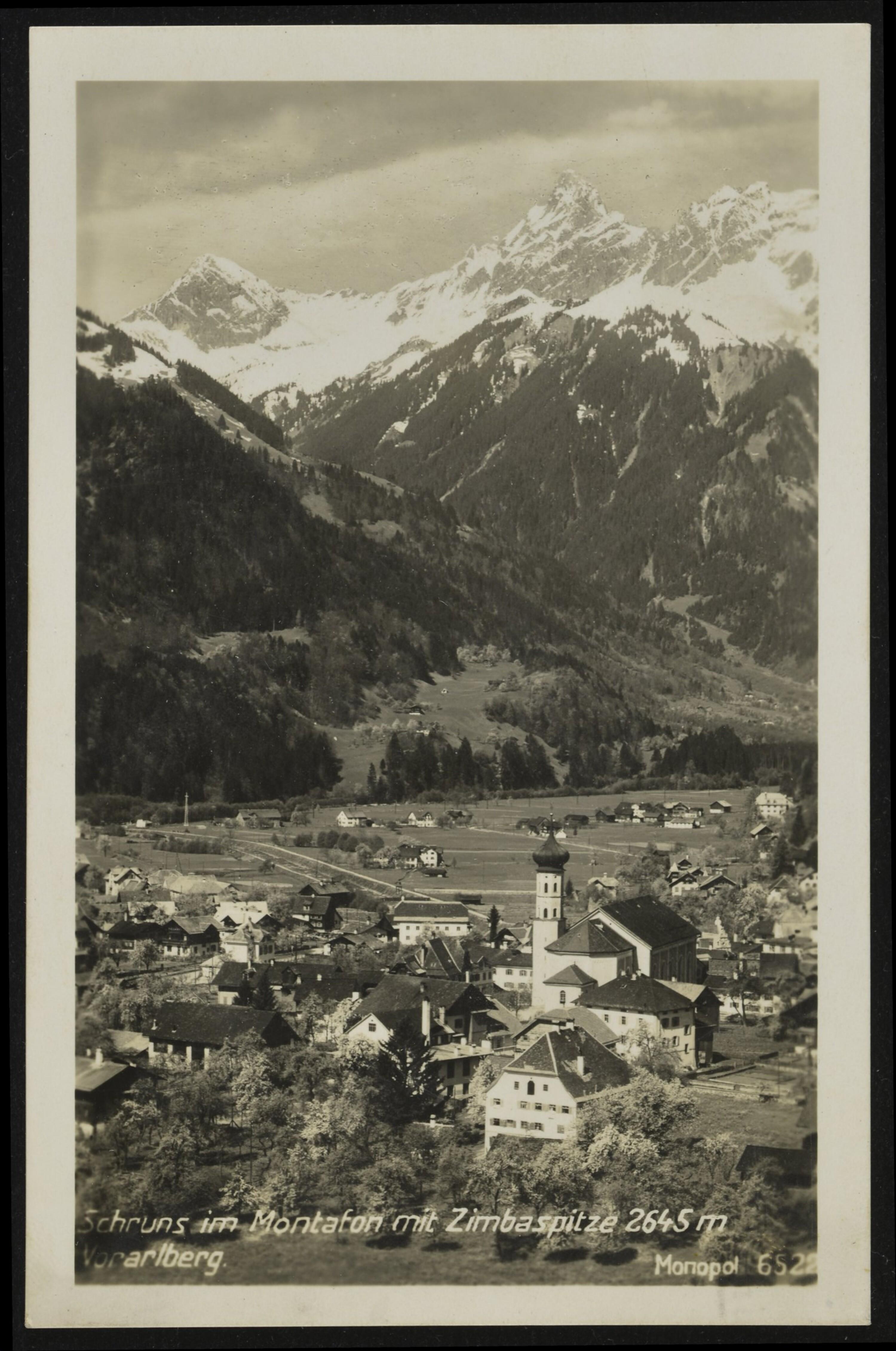 Schruns (Montafon) mit Zimbaspitze 2645 m. (Vorarlberg.)