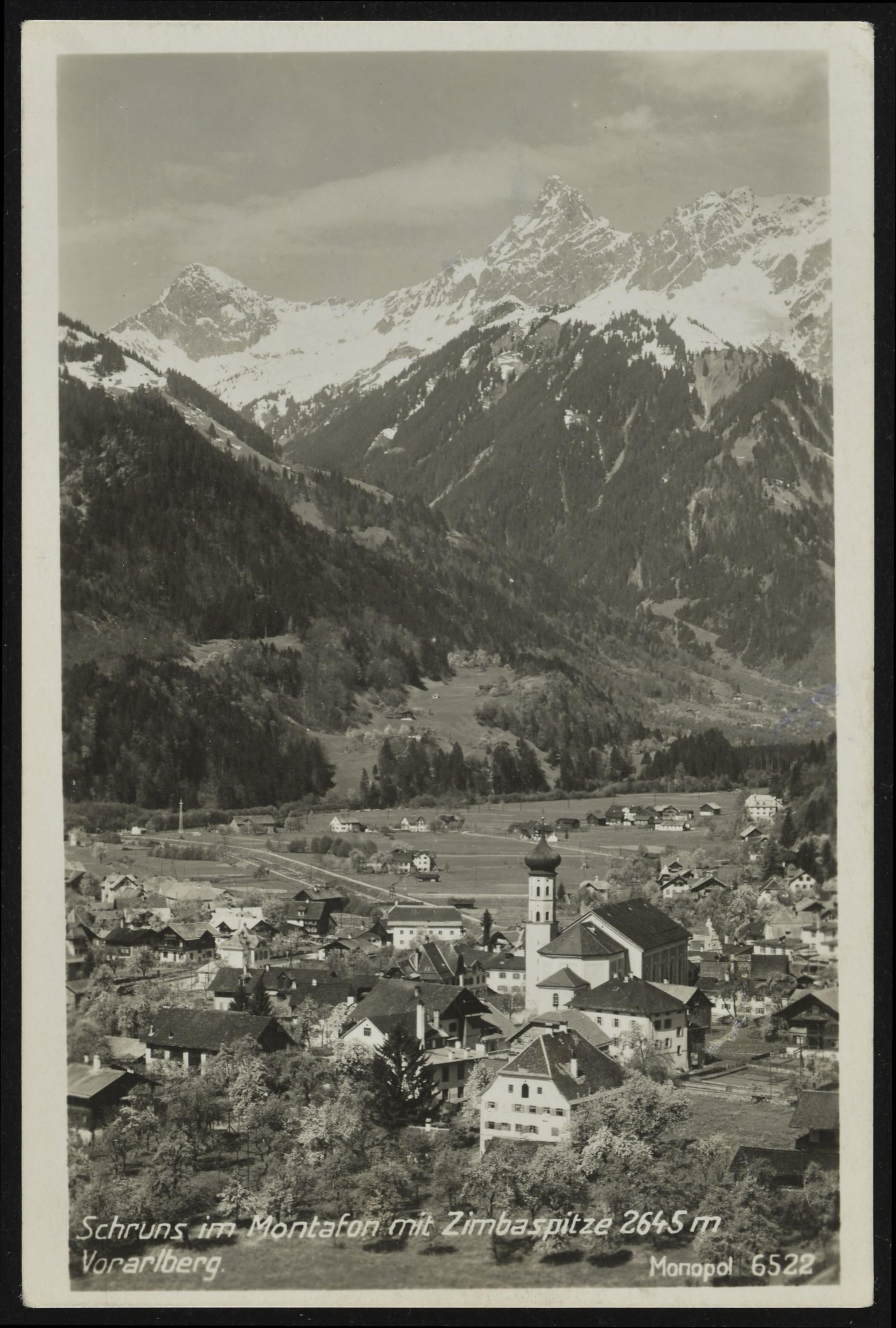 Schruns mit Zimber-Sp. 2645 m (Vorarlberg) : Zimber-Sp. 2645 m. : [Correspondenz-Karte ...]