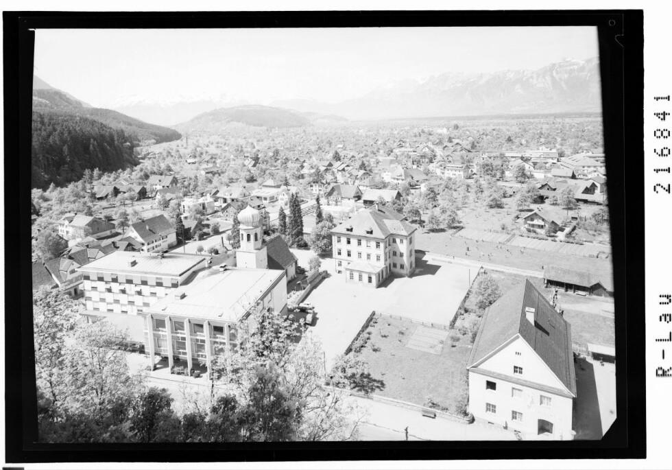 [Braugaststätte Schwarzer Adler in Rankweil mit Blick zu den Balfrieser Bergen und zur Alpsteingruppe]