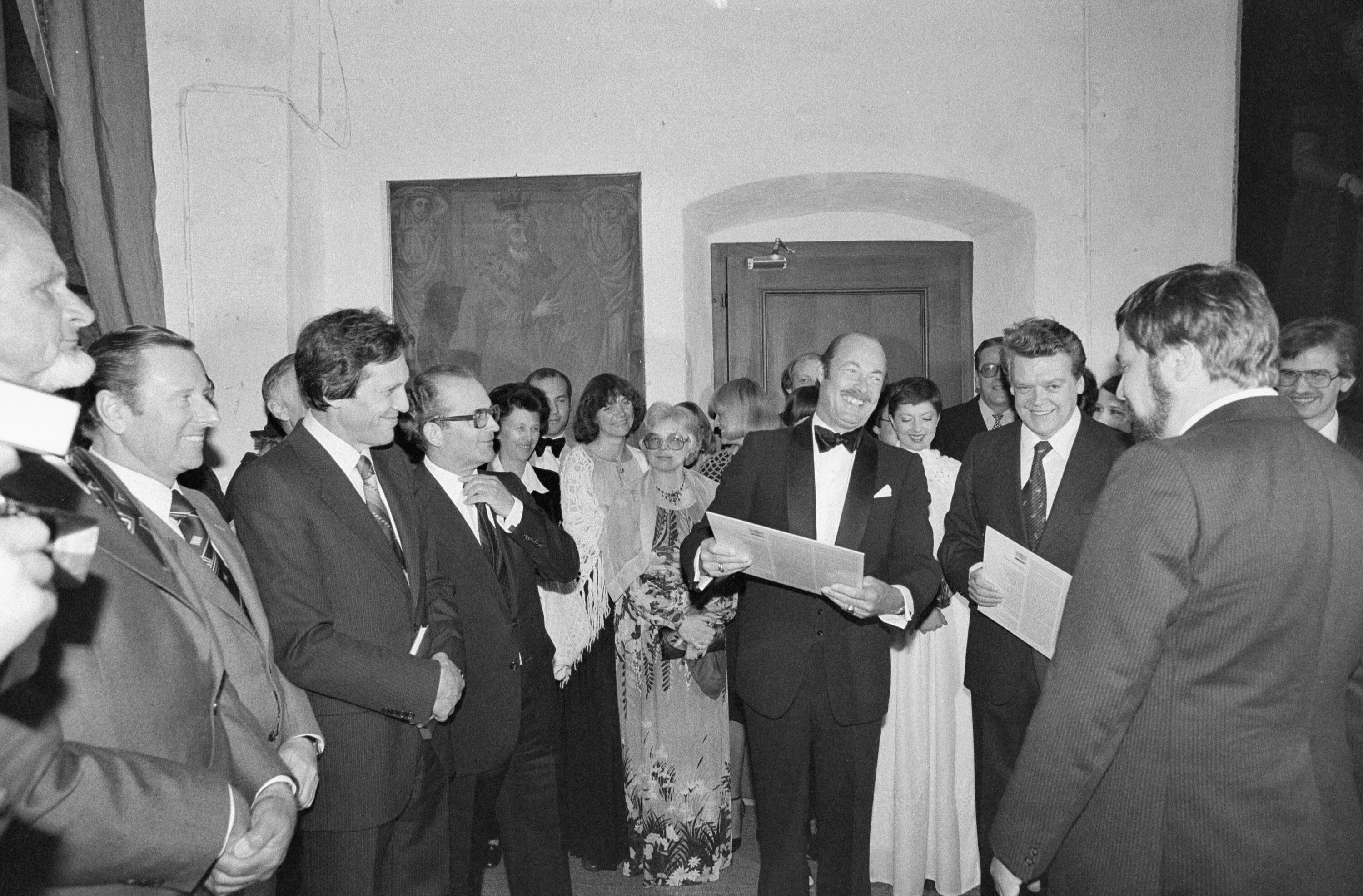• o:228514: mit Schallplatten v.l.n.r.: Otto Amann, Herbert Keßler, Franz Josef Waldburg-Zeil, unbekannt, Hermann Prey
