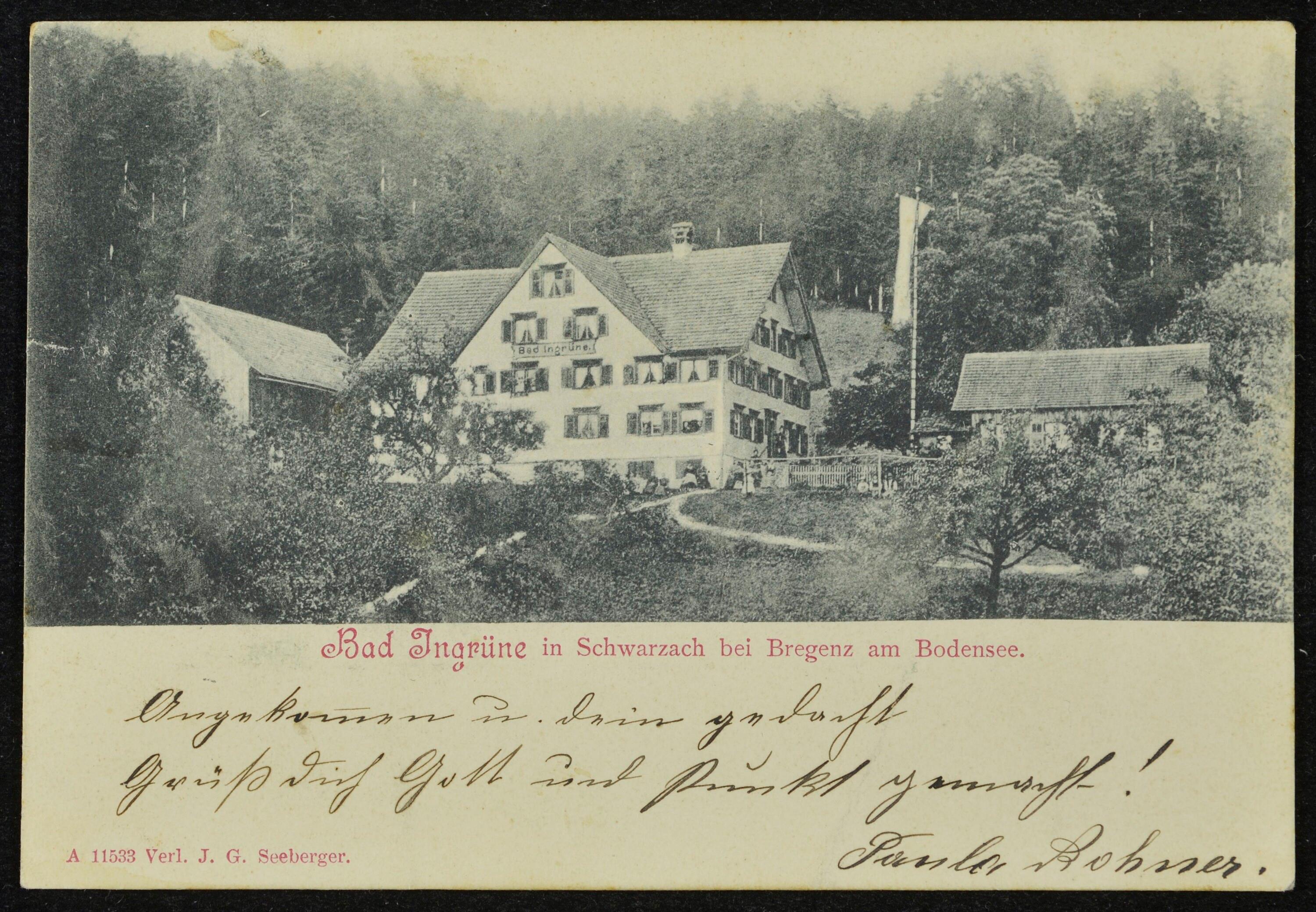 [Schwarzach] Gruss aus Bad Jngrüne b. Bregenz, Vorarlberg : Prachtvolle Aussicht über Bodensee u. Schweizer Alpen. 1/2 Stunde vom Bahnhof Schwarzach 600 m ü. M. : Bad u. Gastwirtschaft Jngrüne Vorzügliche Heilquellen, Luftcurort, Sommerfrische. Preiswürdige Pension, billige Zimmer : [Correspondenz-Karte An ... in ...]