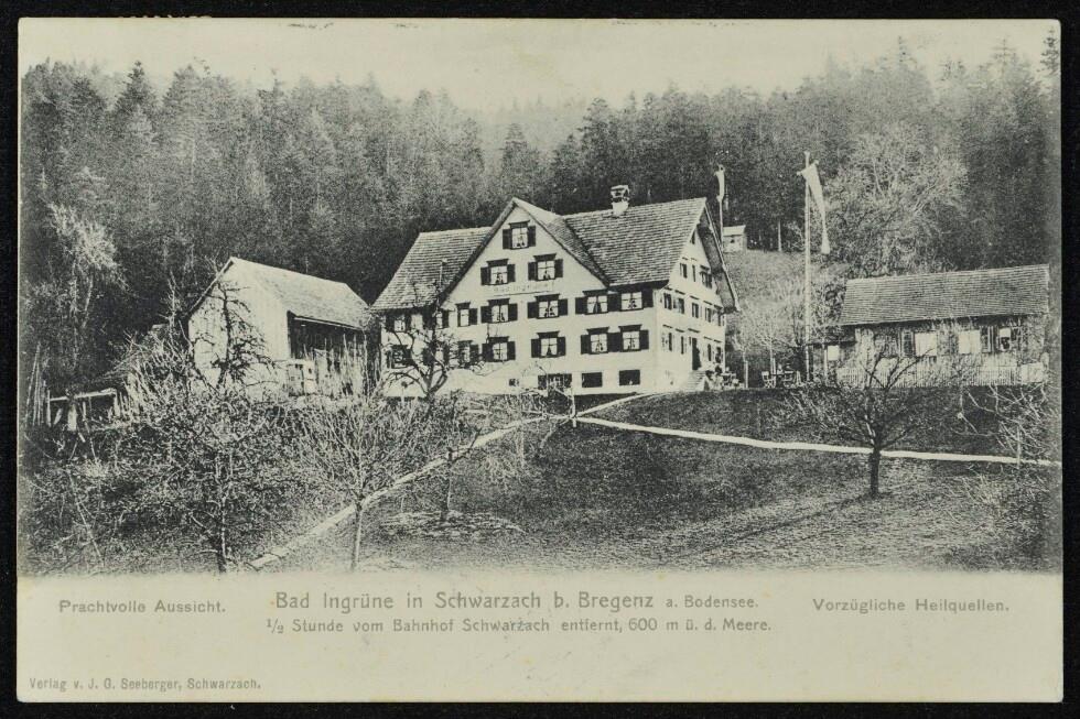 [Schwarzach] Gruss aus Bad Jngrüne b. Bregenz, Vorarlberg : Prachtvolle Aussicht über Bodensee u. Schweizer Alpen. 1/2 Stunde vom Bahnhof Schwarzach 600 m ü. M. : Bad u. Gastwirtschaft Jngrüne Vorzügliche Heilquellen, Luftcurort, Sommerfrische. Preiswürdige Pension, billige Zimmer : [Correspondenz-Karte An ... in ...]