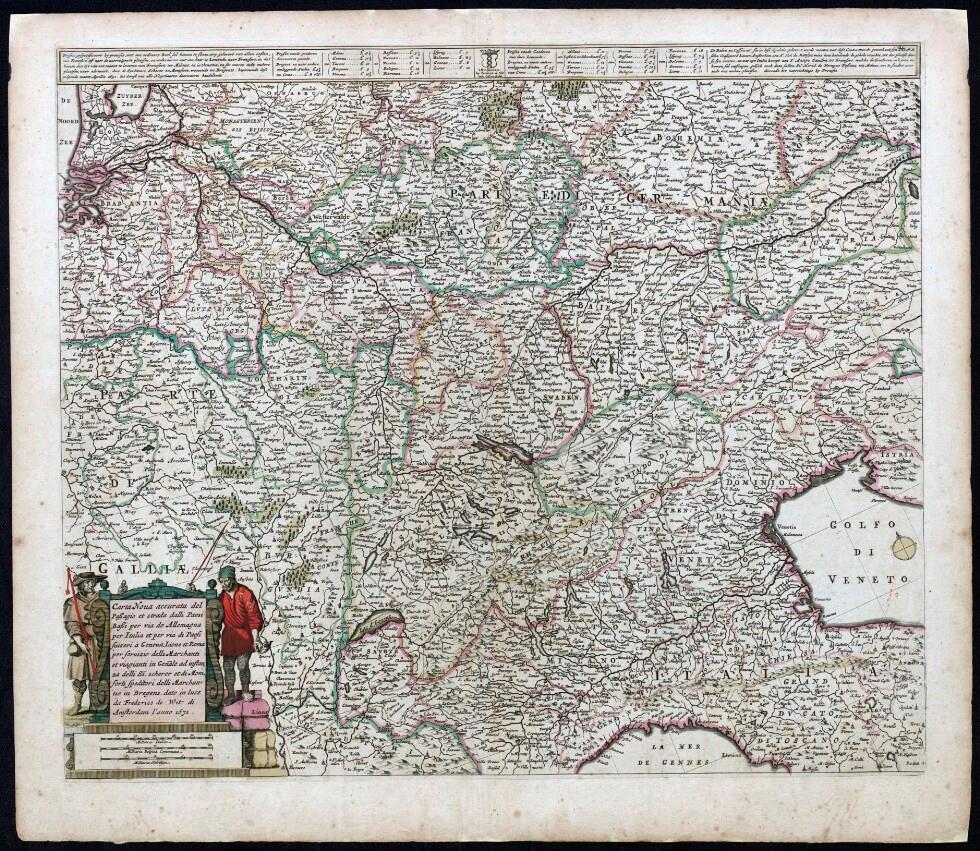 Carta Noua accurata del Paßagio et strada dalli Paesi Baßi per via de Allemagna per Italia et per via di Paesi Suizeri à Geneua, Lione et Roma per seruizio delli Marchanti et viagianti in Gen[er]ale ad instanza delli Ss. scherer et di Momforti speditori delli Marchantie in Bregens