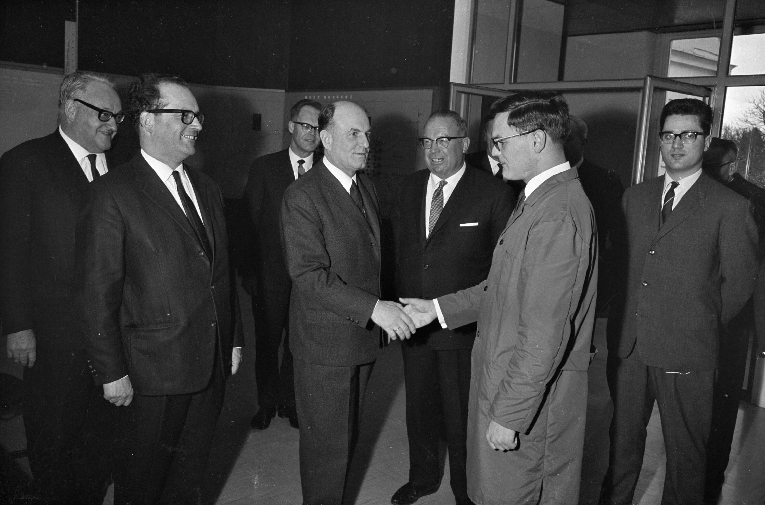 • o:249255: hintere Reihe: unbekannt, unbekannt, unbekannt, Generalsekretär Pridun, Generaldirektor Ammann, Josef Klaus, Direktor Wirnschimmel, Herbert Kessler, unbekannt, unbekannt
