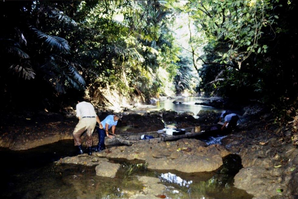 [Ujong-Kulon-Nationalpark auf Java am Fluss Cigentar auf der Suche nach dem Java-Nashorn]