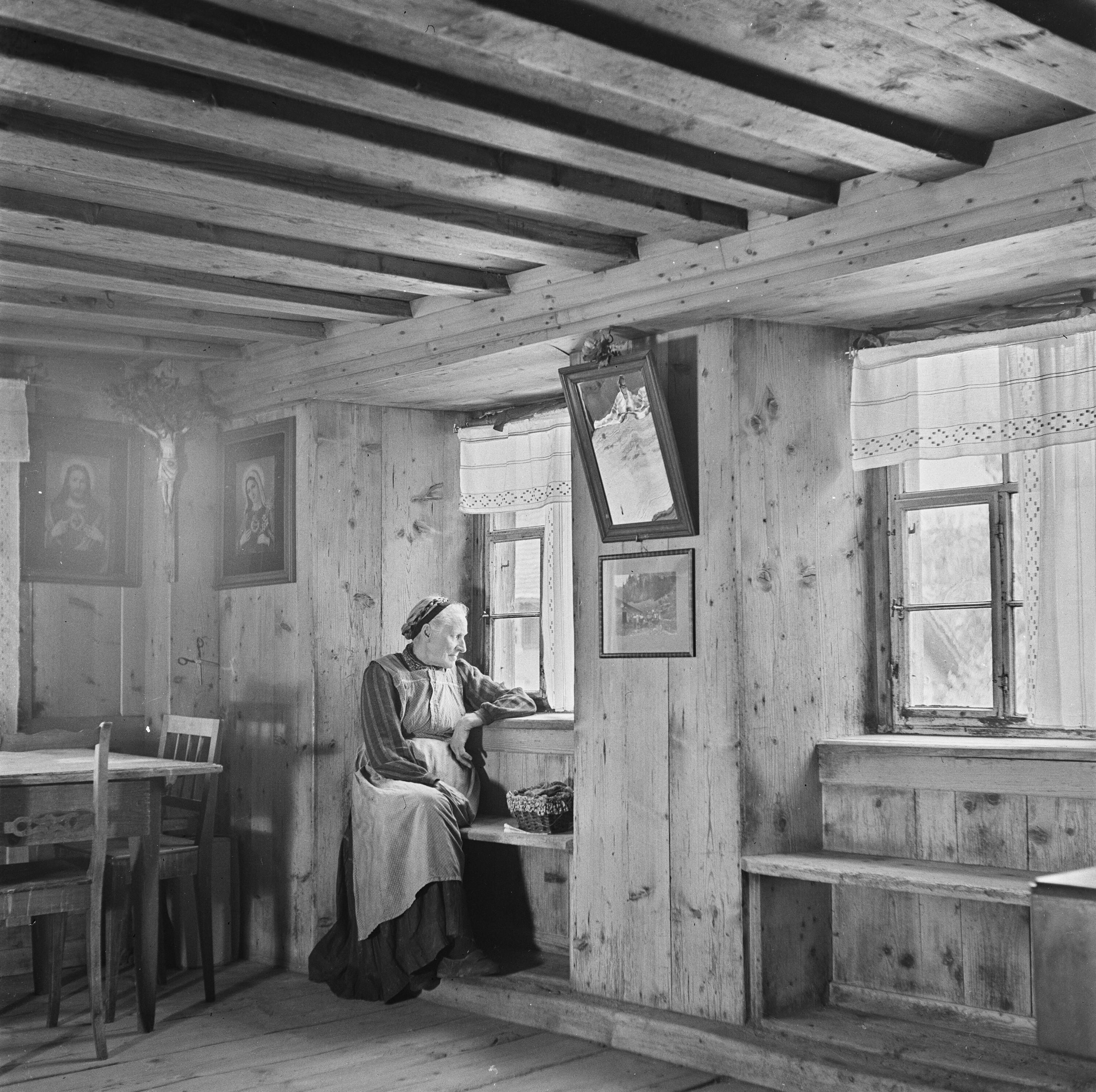 • Frau in Stube blickt aus dem Fenster
