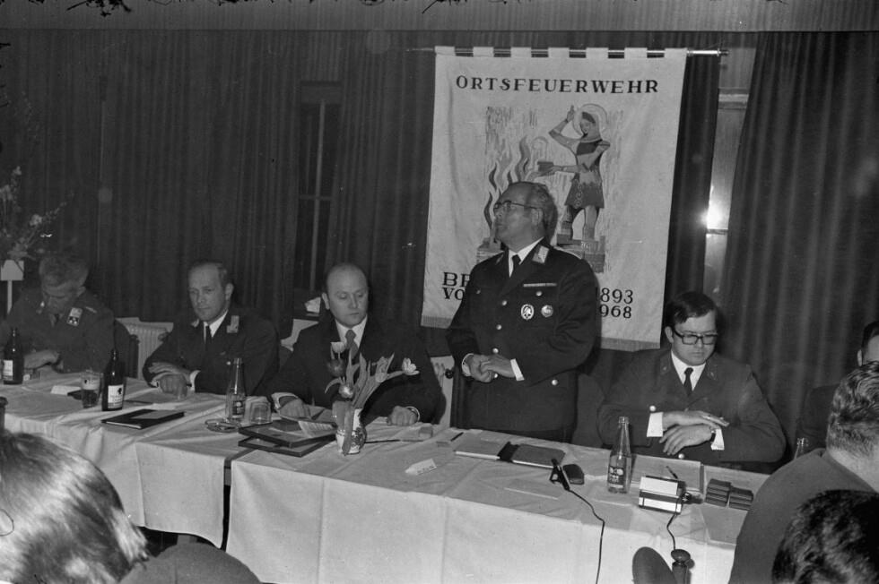 • o:300281: v.l.n.r.: unbekannt, Fritz Mayer, Brandmeister Hans Jehle, Kommandant Kurt Sontag