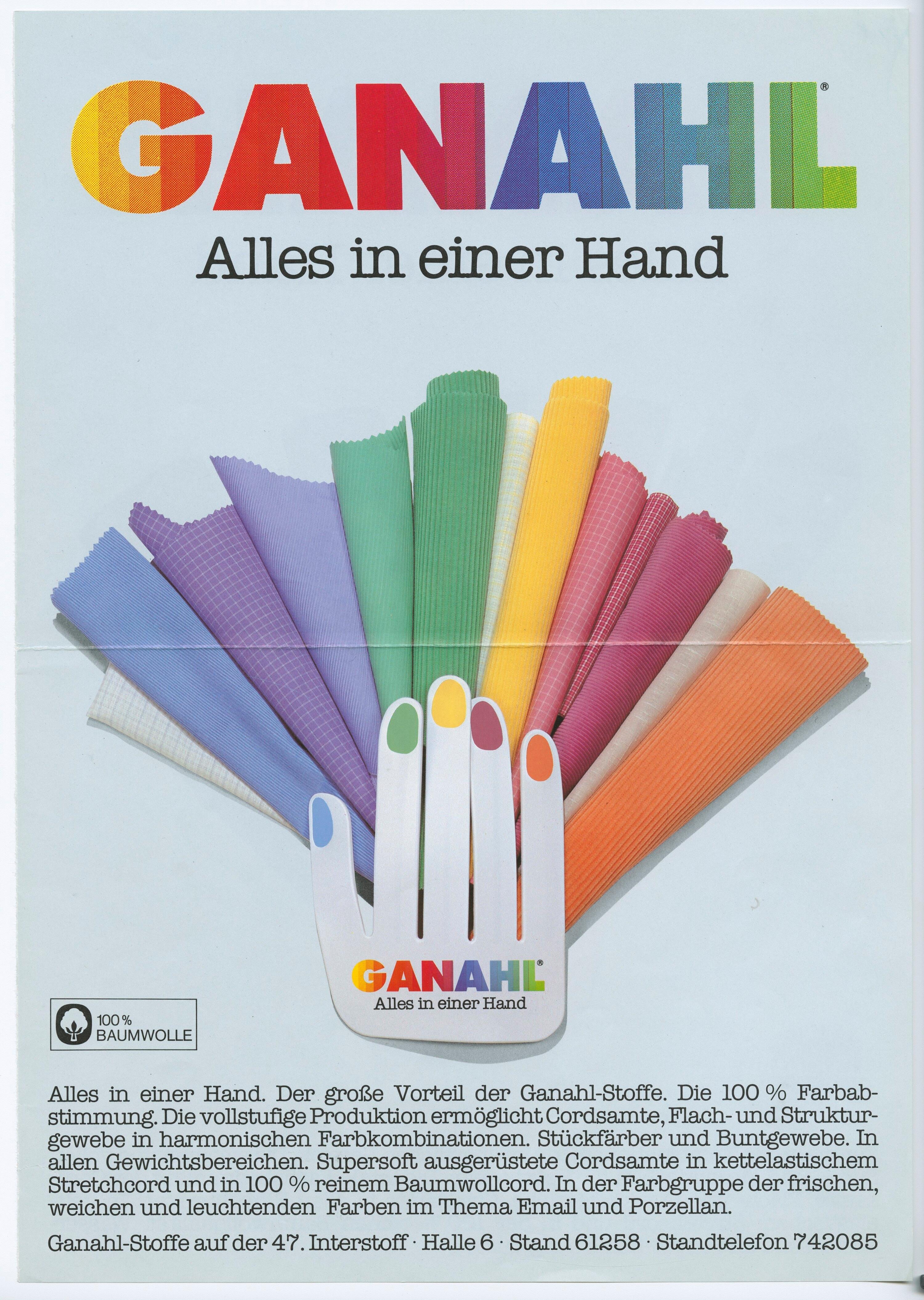 • Originaltext: GANAHL, Alles in einer Hand, Der große Vorteil der Ganahl-Stoffe. Die 100 % Farbabstimmung. Die vollstufige Produktion ermöglicht Cordsamte, Flach- und Strukturgewebe in harmonischen Farbkombinationen. [...]
