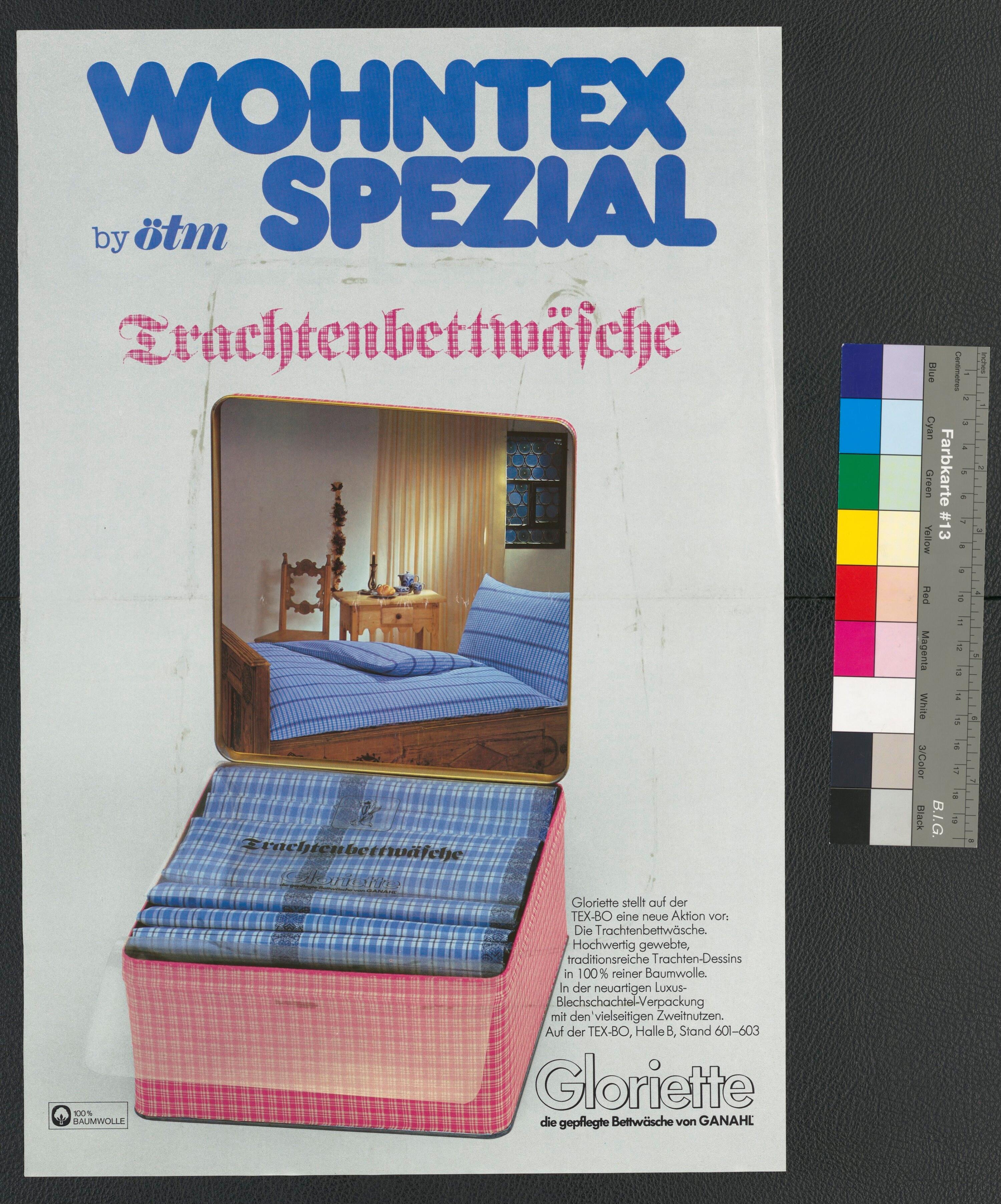 • Originaltext: WOHNTEX by ötm SPEZIAL Trachtenbettwäsche, Gloriette stellt auf der TEX-BO eine neue Aktion vor: Die Trachtenbettwäsche. Hochwertig gewebte, traditionsreiche Trachten-Dessins in 100 % reiner Baumwolle. In der neuen Luxus-Blechschachtel-Verpackung mit dem vielseitigen Zweitnutzen. [...]