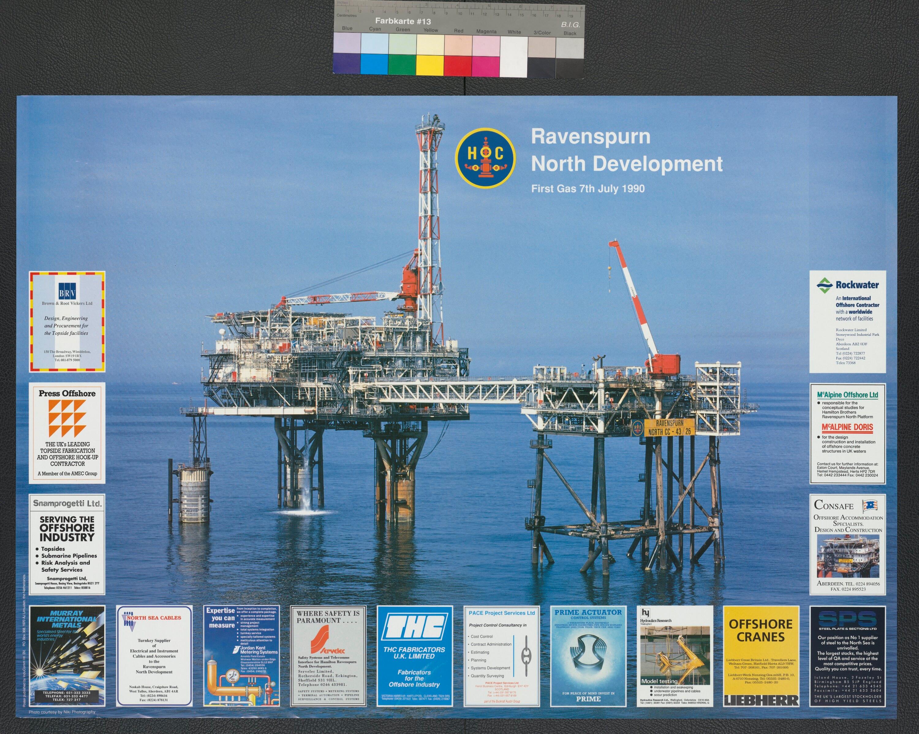• Farbfotoplakat; Darstellung von Ölplattform im Meer; an den Seitenrändern Angaben der an der Herstellung beteiligten Firmen, z.B. Liebherr