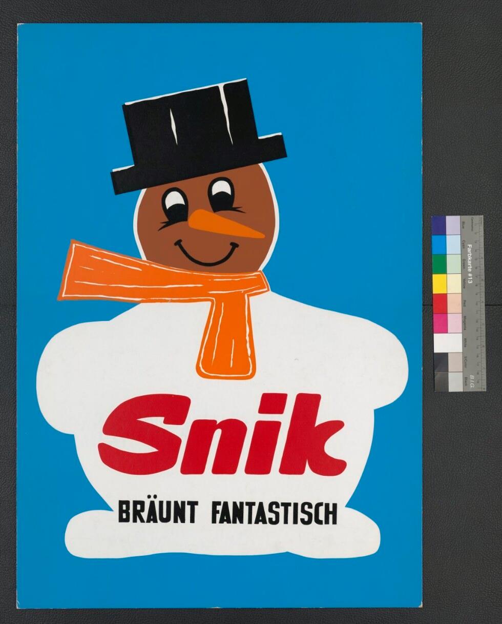 • Farbgemalter Plakatsteher; Werbung für Sonnencreme der Marke Snik; Schneemann auf blauem Hintergrund