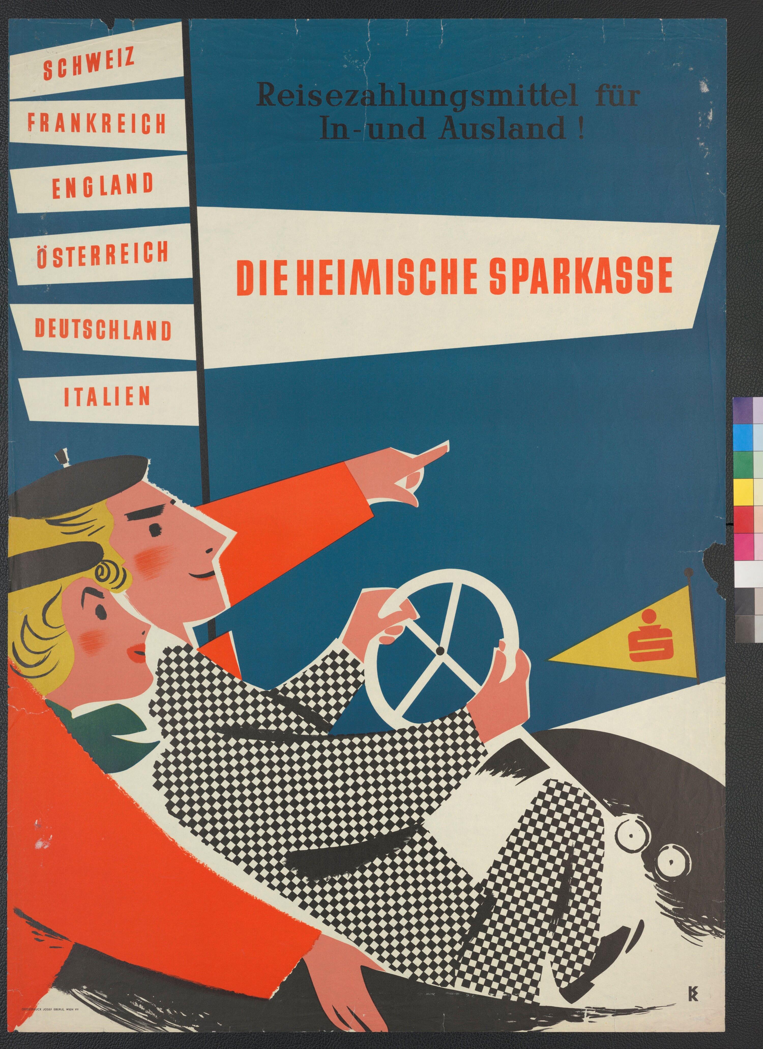 • Farbgemaltes Werbeplakat; Gemeinschaftswerbung der Sparkassen; Darstellung von Mann und Frau in Auto sitzend