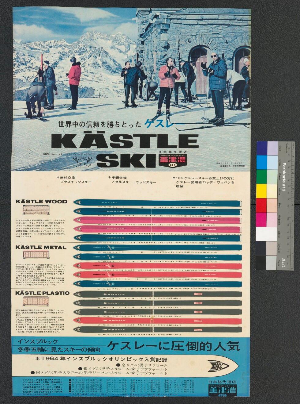 • Plakat gerahmt hinter Glas; im oberen Teil Motiv Wintersport gemalt (schneebedeckte Berge, Skiläufer, sonst. Personen, Gebäude aus Stein); Aufschrift Kästle Ski; Kästle Ski Kollektion aus Holz, Metall und Kunststoff (Abbildungen der Ski mit Infos); sämtliche Infos auf japanisch