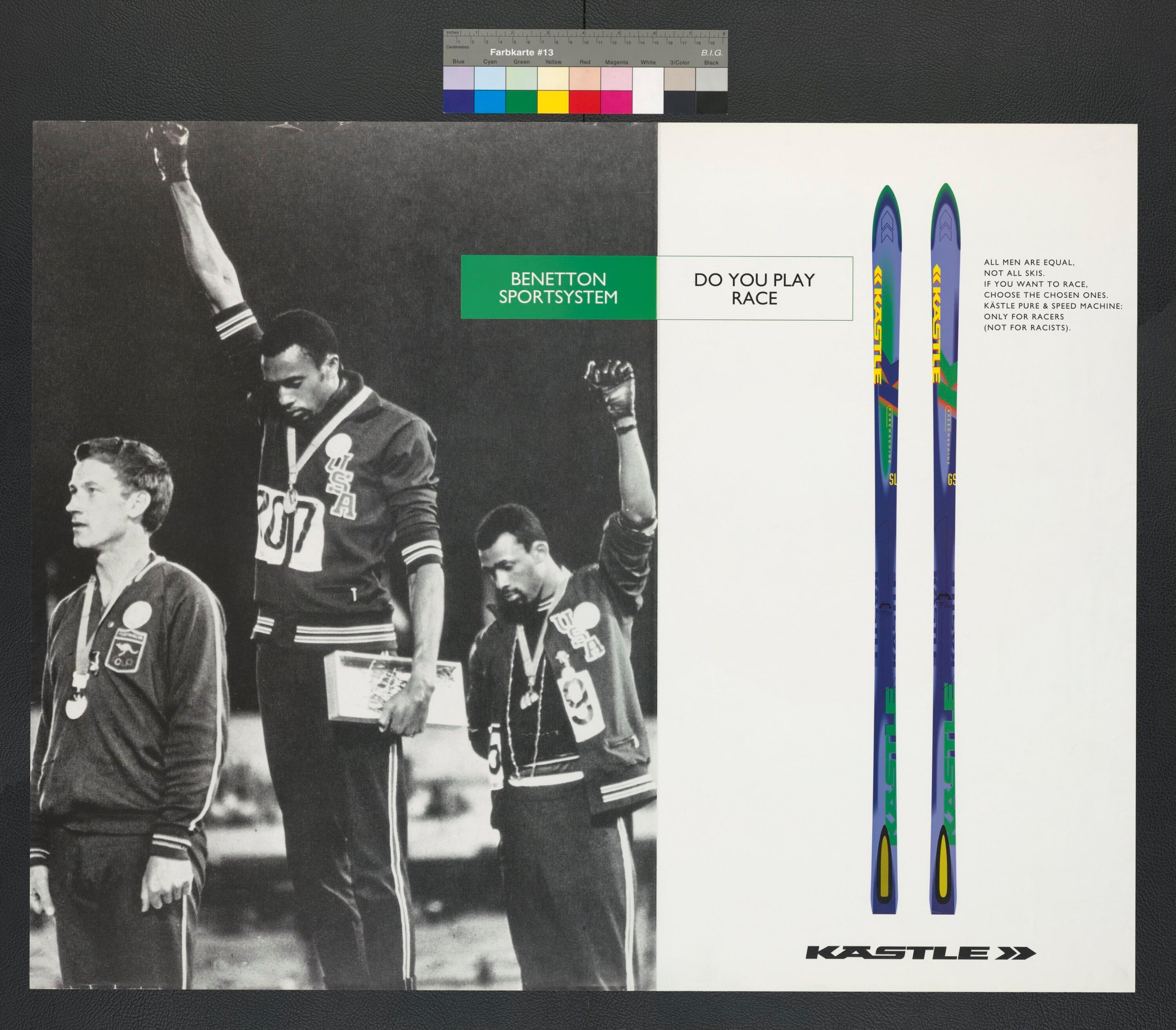 • Werbeplakat mit dem Bild einer Siegerehrung, bei der zwei Sportler die Fäuste hochrecken sowie Schriftzüge von Benetton Sportsystem und Kästle neben und unter dem Bild von Kästle Ski Pure Machine SL und Speed Machine