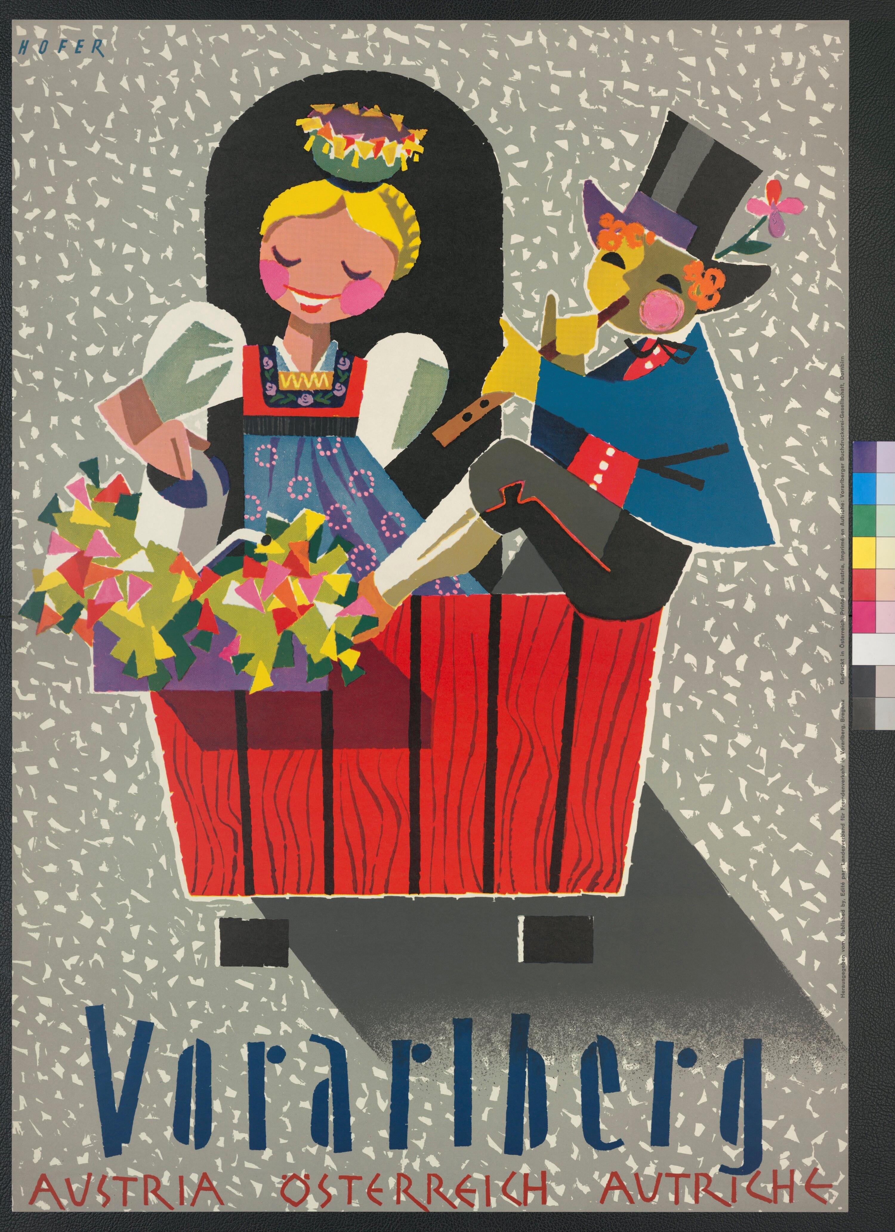 • Farbgemaltes Plakat; Mann und Frau in Tracht auf Balkon; Hintergrund grau-weiß gemustert; Signatur Hofer