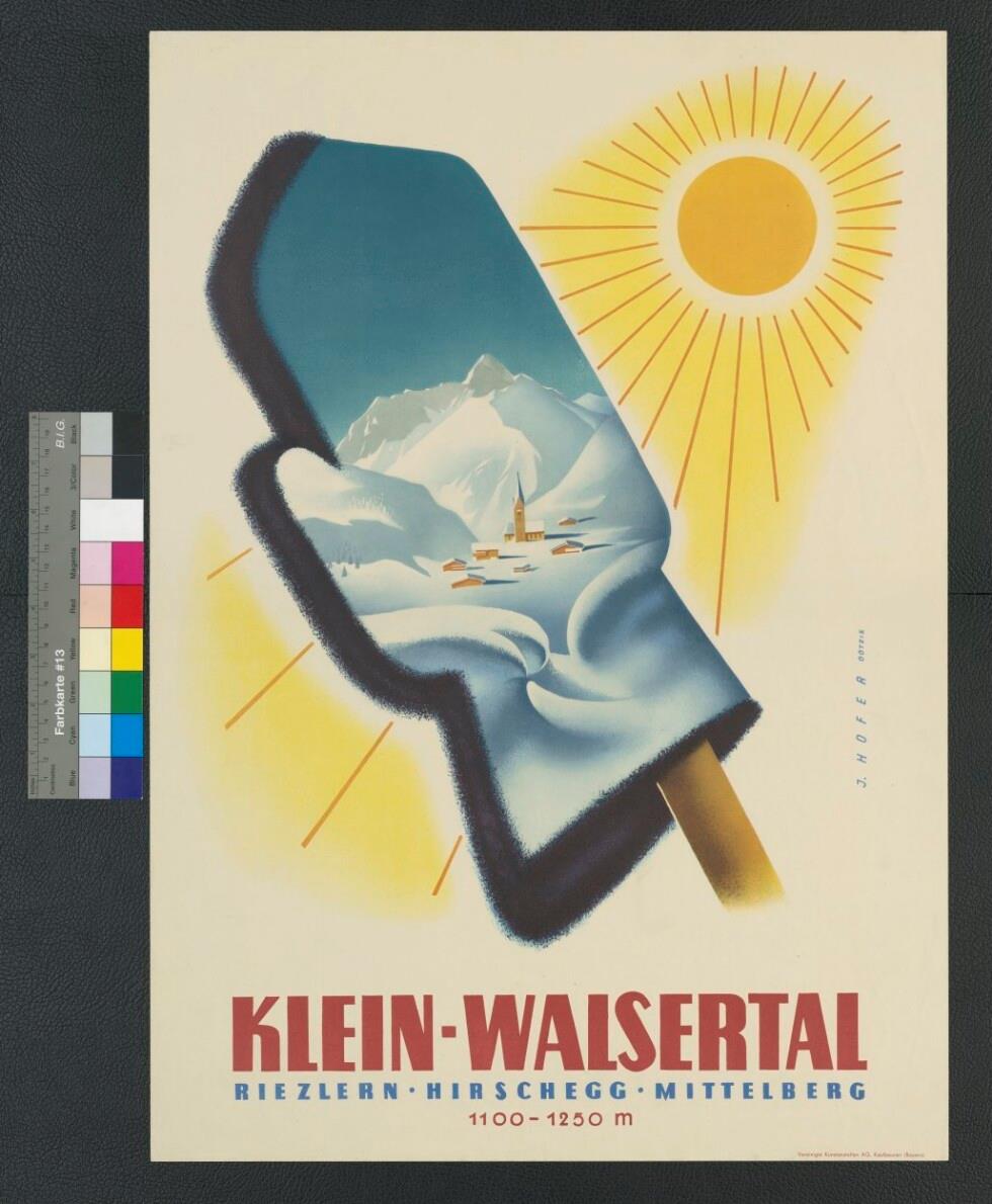 • Farbgemaltes Plakat; Handschuh auf Stecken mit Winterlandschaft; im Hintergrund strahlende Sonne; Signatur J. Hofer Götzis