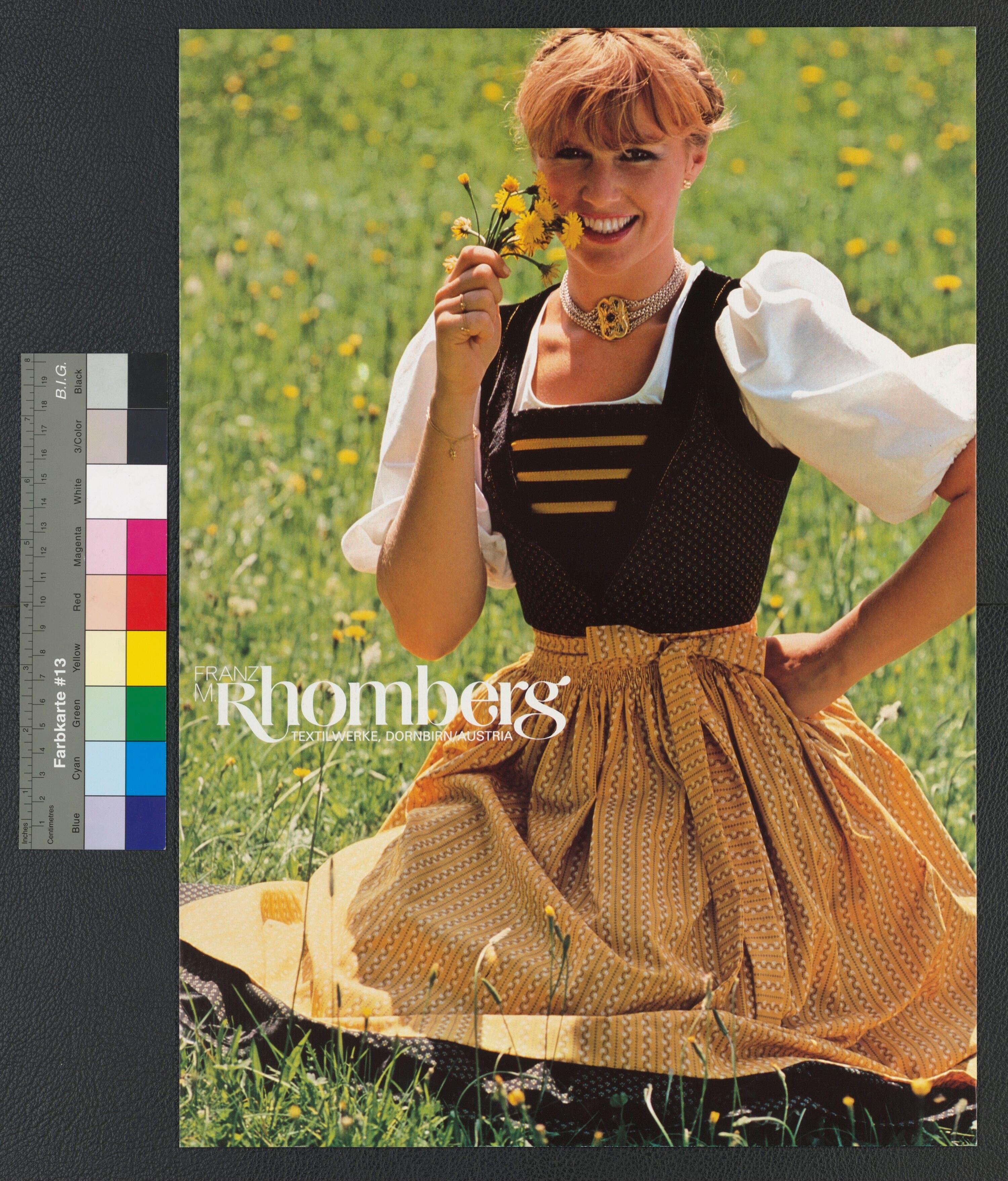• Farbfotoplakat; Werbung für Dirndlstoffe; Frau in Dirndl auf Blumenwiese; weißer Schriftzug; ohne Signatur