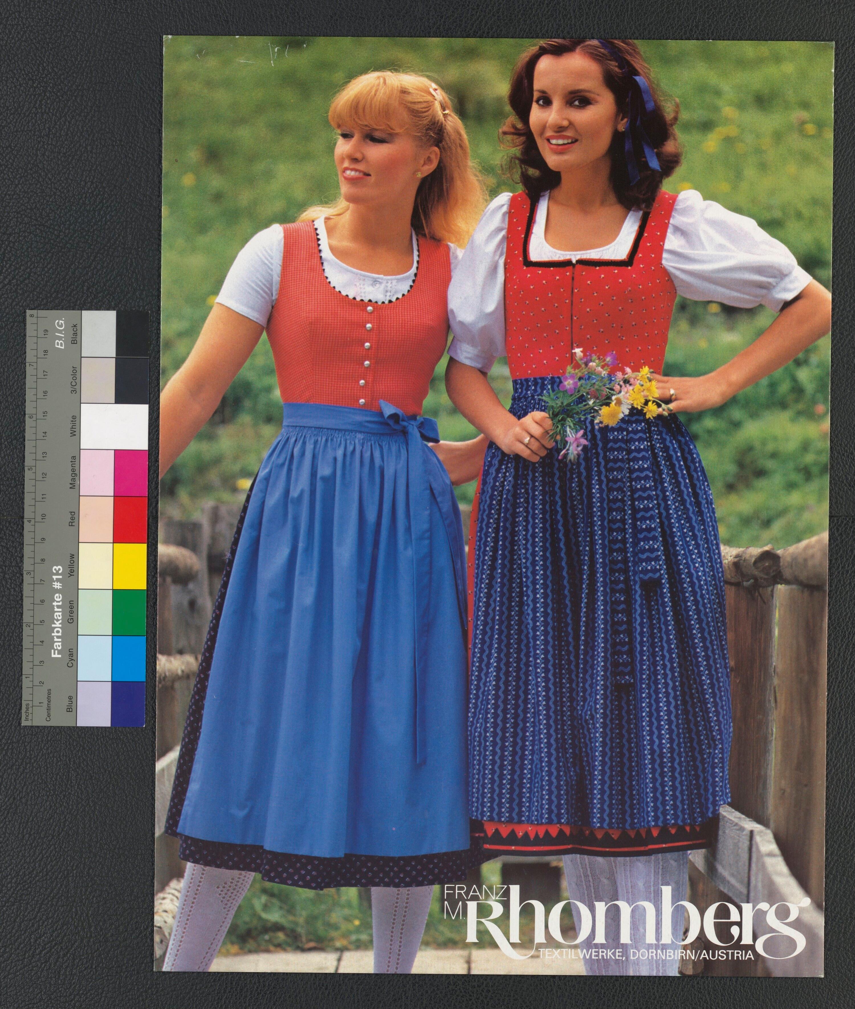 • Farbfotoplakat; Werbung für Kleiderstoffe; zweiFrauen in rot-blauen Dirndeln; weißer Schriftzug; ohne Signatur
