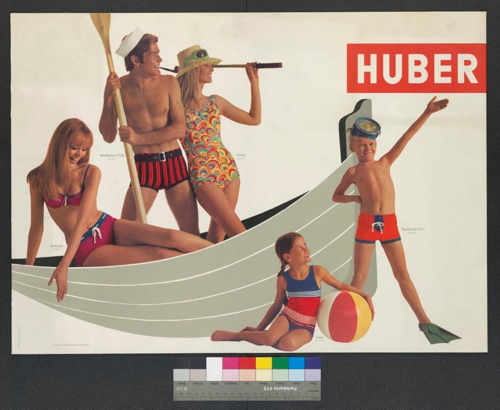 • Fotoplakat in Farbe; Werbung für Bademode; Foto von Personen in Badebekleidung mit grau gemaltem Boot; Hintergrund weiß; enthält Preisangaben in Schilling; Hintergrund weiß; rot-weißes Huber-Logo; ohne Signatur