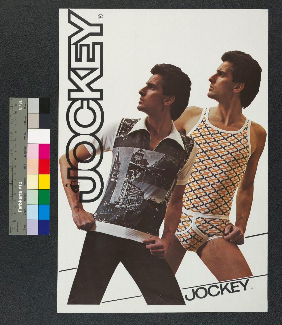 • Fotoplakat in Farbe; von Männern in Ober- und Unterbekleidung der Marke Jockey; Hintergrund weiß; schwarz-weißer Jockey-Schriftzug; ohne Signatur