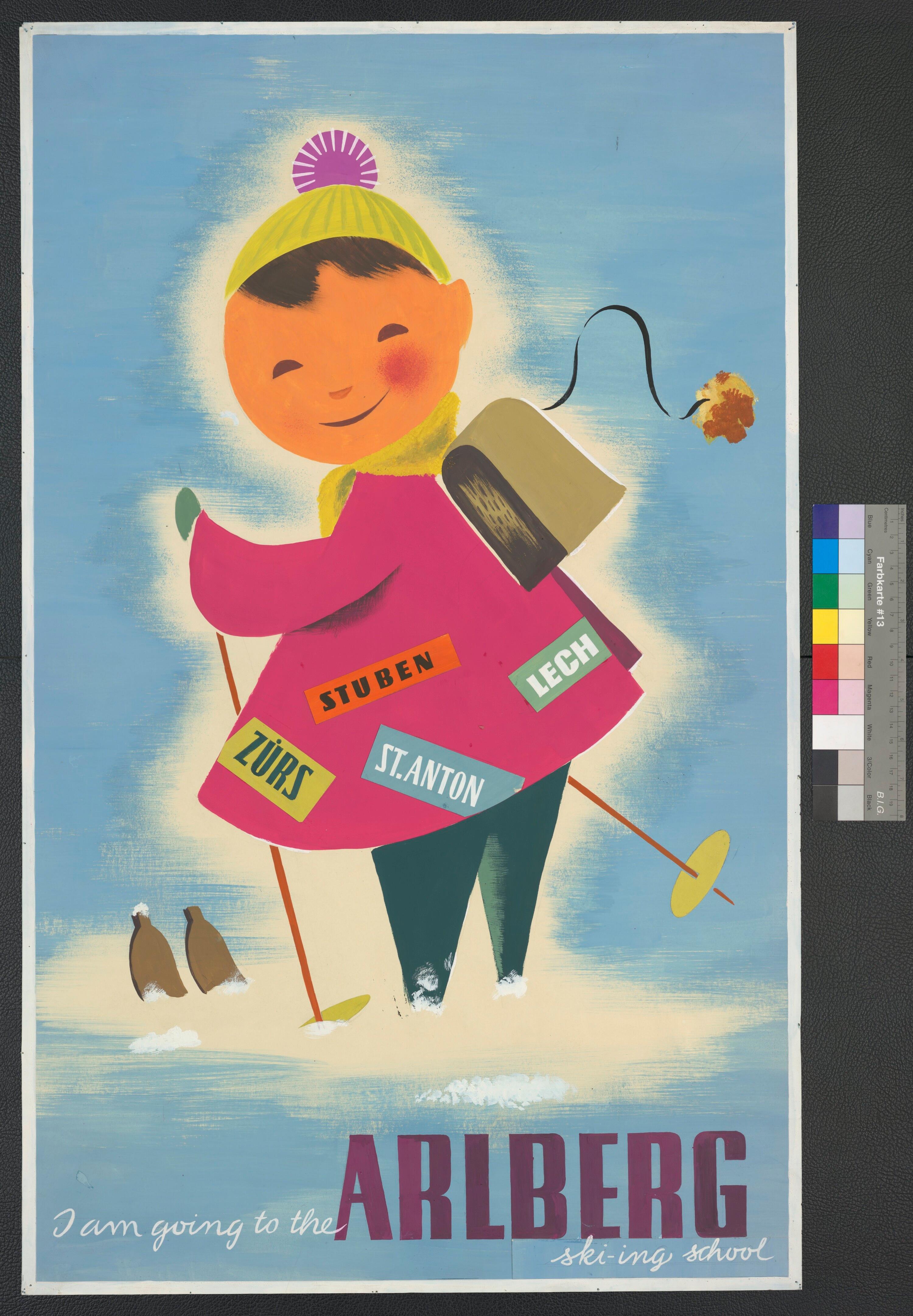 • Farbgemaltes Plakat; Kind mit Rucksack und rosa Mantel auf Skiern; Hintergrund hellblau; ohne Signatur