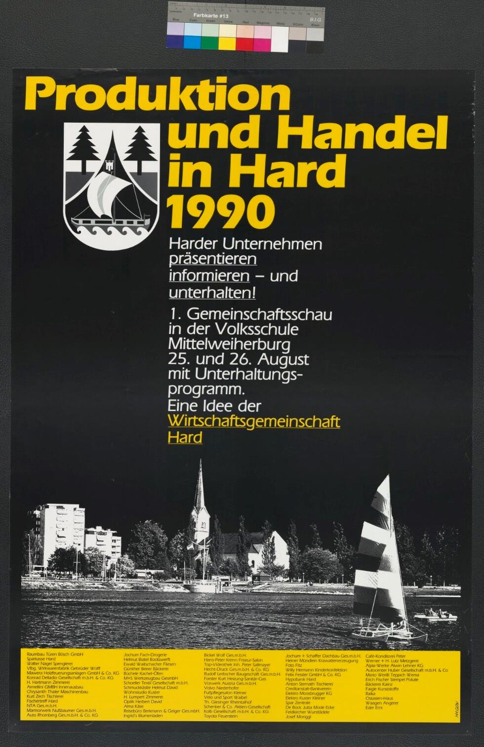 • Originaltext: Produktion und Handel in Hard 1990; Harder Unternehmen präsentieren, informieren und unterhalten; 1. Gemeinschaftsschau in der Volksschule Mittelweiherburg