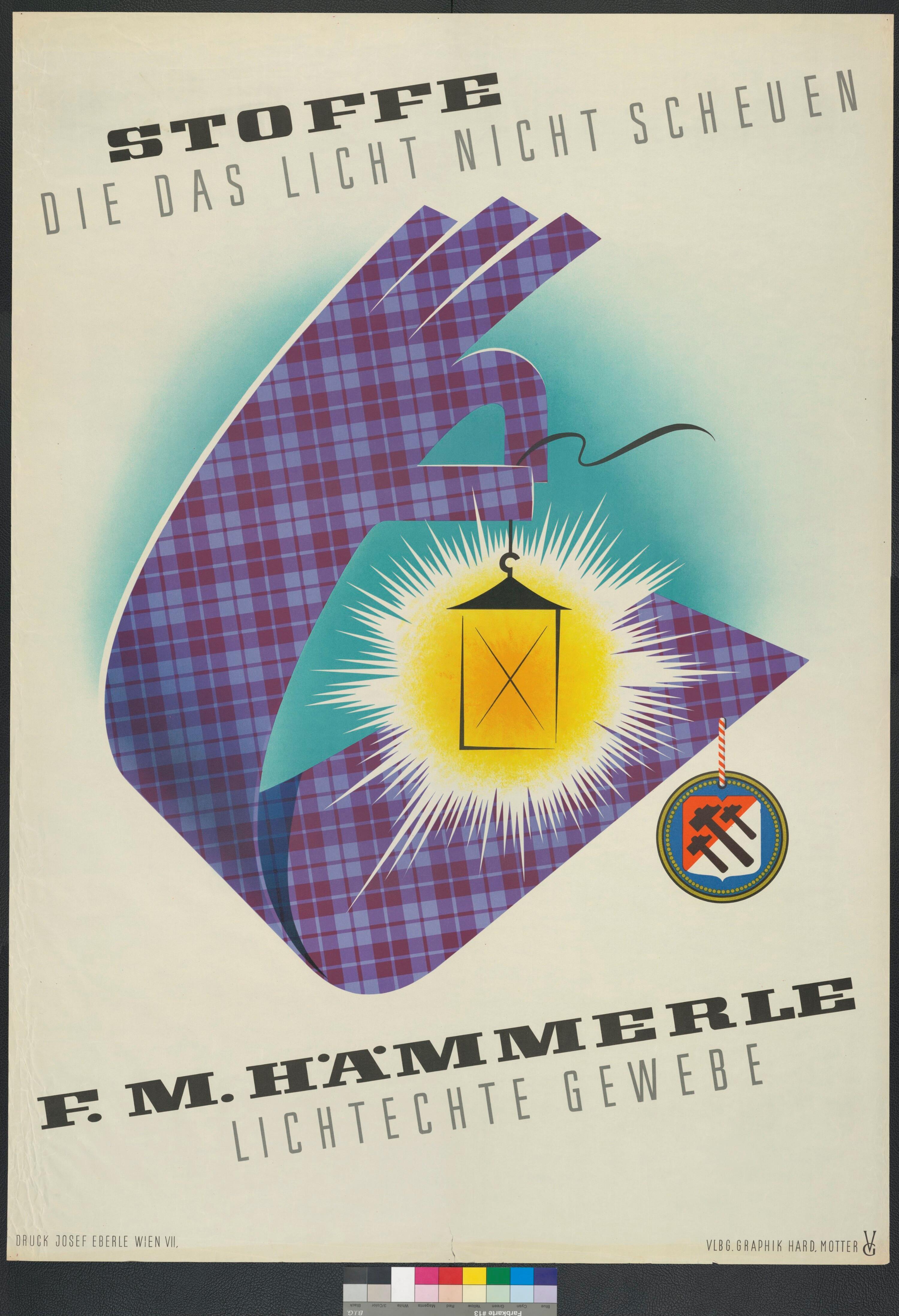 • Gemaltes Plakat in Farbe; Werbung für Stoffgewebe; violettes Stoffgewebe in Handform hält Laterne; Hintergrund türkis-weiß; Signatur Vlbg. Graphik Hard, Motter