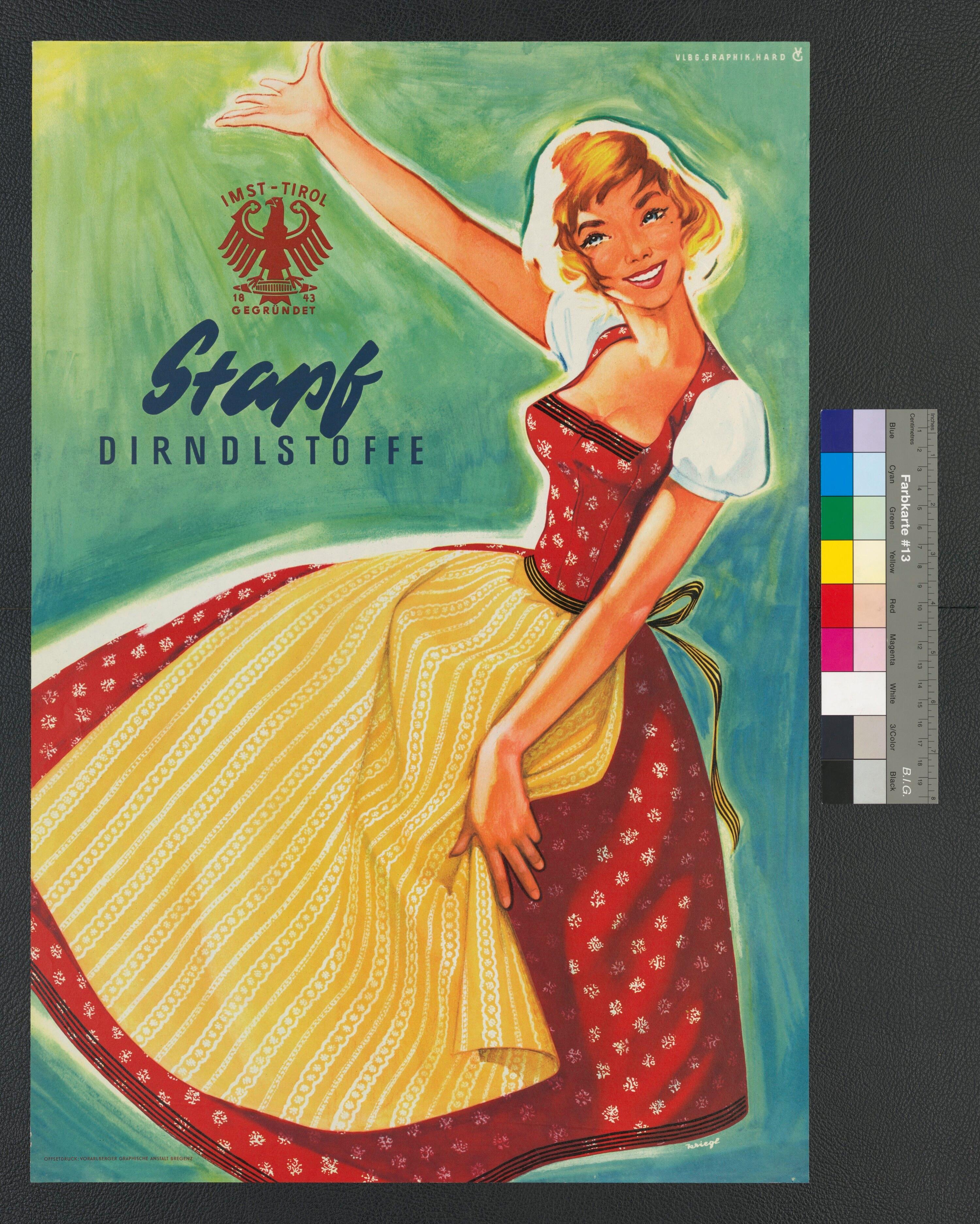 • Gemaltes Plakat in Farbe; Werbung für Dirndl; Frau in rot-weißem Dirndl mit gelb-weißer Schürze; Hintergrund blau-grün-gelb; Signatur Vlbg. Graphik Hard, Kriegl