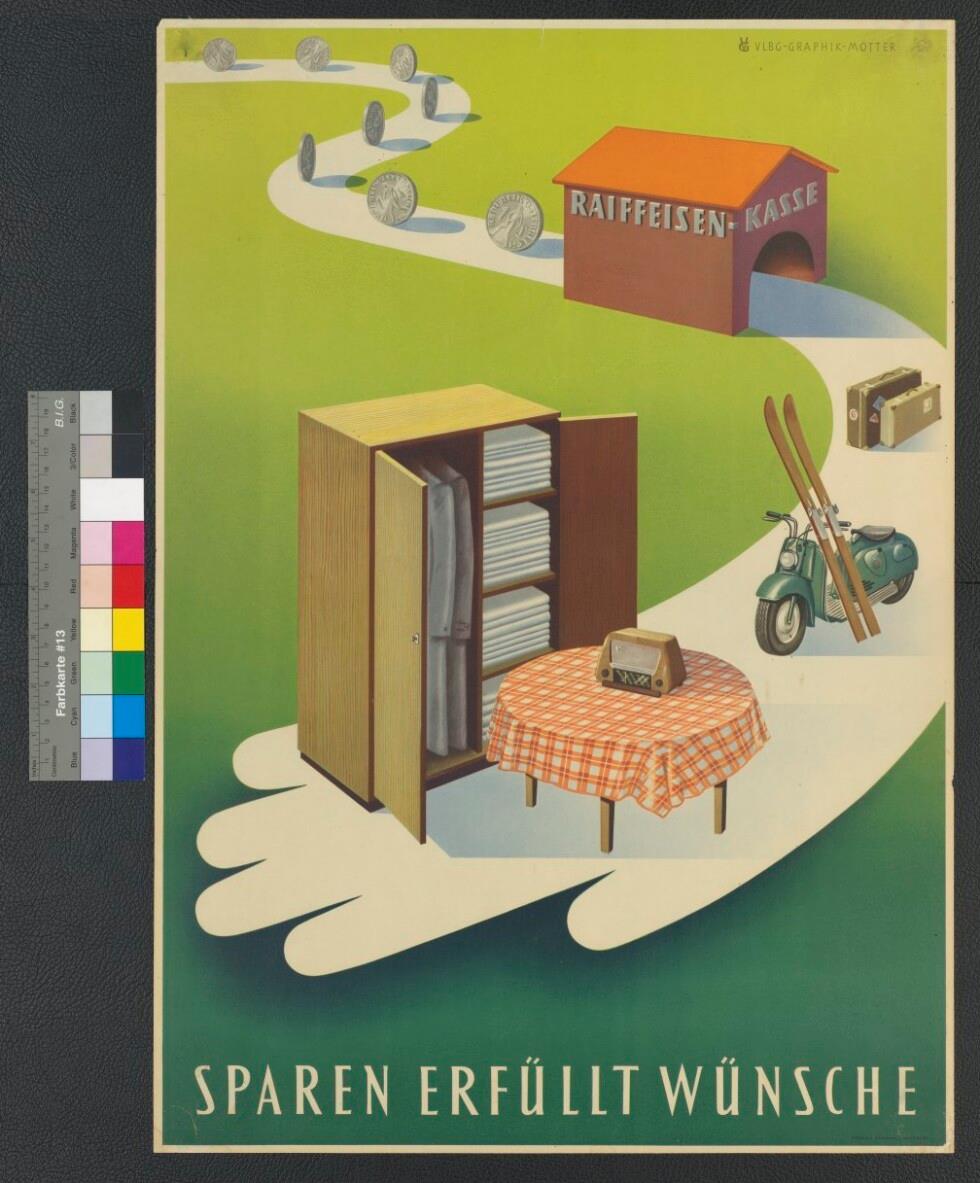 • Gemaltes Plakat in Farbe; Werbung für Sparprodukte; Straßentunnel mit Raiffeisen-Aufschrift; von hinten rollen Schillingmünzen hinein, vorne erscheinen Konsumgüter (Tisch, Schrank, Roller, Ski...); Hintergrund grün-Töne; Signatur Vlbg.-Graphik-Motter
