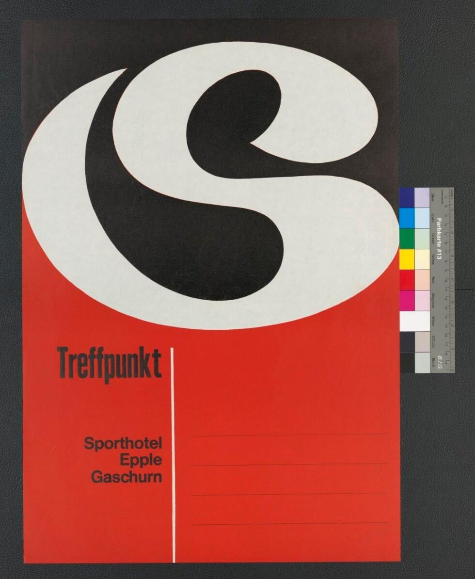 • Werbeplakat mit Linien für Termine und Titel von Veranstaltungen; weiße S-Form auf schwarzem und roten Grund; Text auf rotem Grund