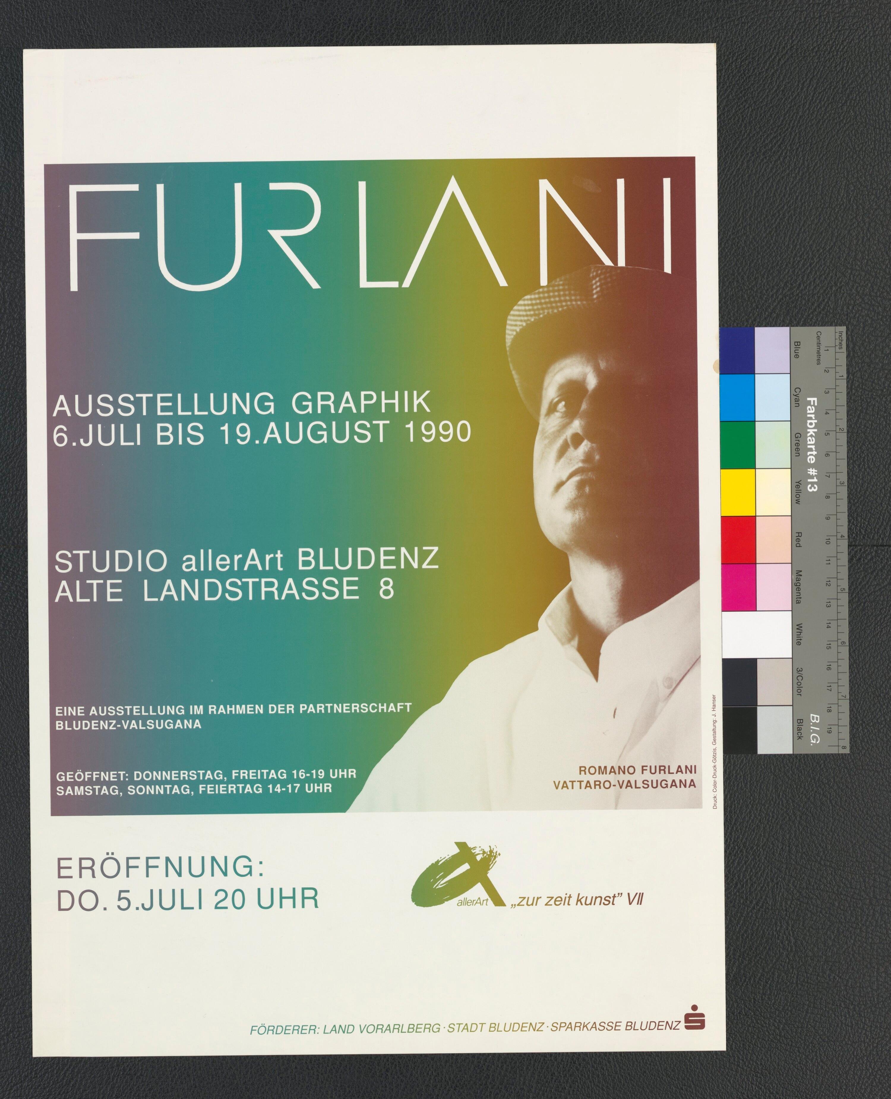 • Originaltext: zurzeitkunst' VII; FURLANI AUSSTELLUNG GRAPHIK; 6. Juli bis 19. August 1990; Studio allerArt Bludenz; Eine Ausstellung im Rahmen der Partnerschaft Bludenz - Valsugana; Fotografi: ROMANO FURLANI; VATTARO-VALSUGANA; Gestaltung J. Hanser; Druck: Color-Druck Götzis