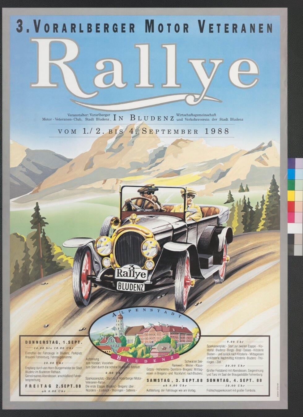 • Originaltext: 3. Vorarlberger Motor Veteranen Rallye in Bludenz 1./2.-4. September 1988; Veranstalter: Vorarlberger Motor-Veteranen-Club Stadt Bludenz; Wirtschaftsgemeinschaft und Verkehrsverein Bludenz