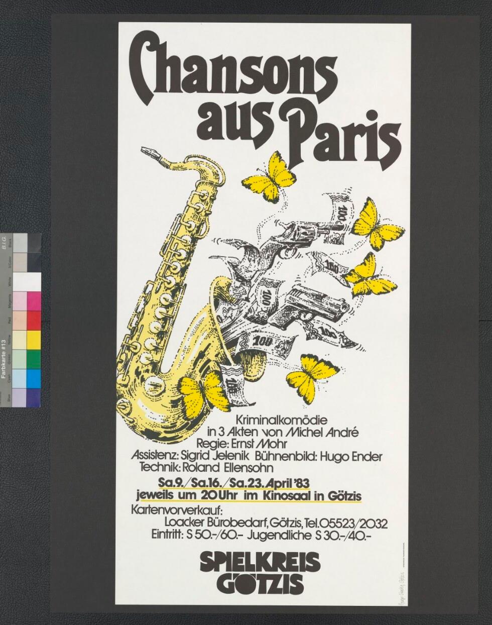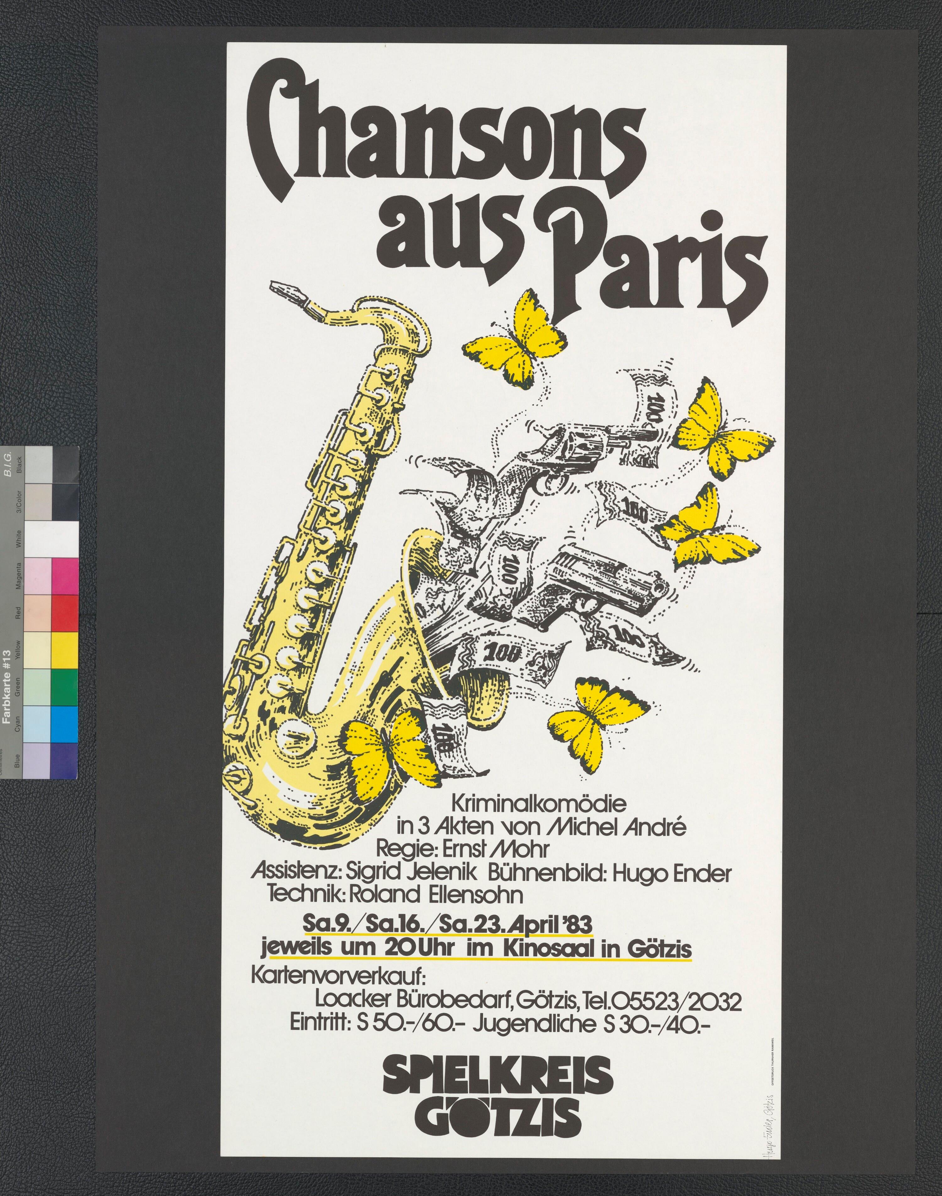 • Originaltext: Chansons aus Paris, Kriminalkomödie in 3 Akten von Michel André; Spielkreis Götzis; 9. bis 23. April '83 im Kinosaal in Götzis