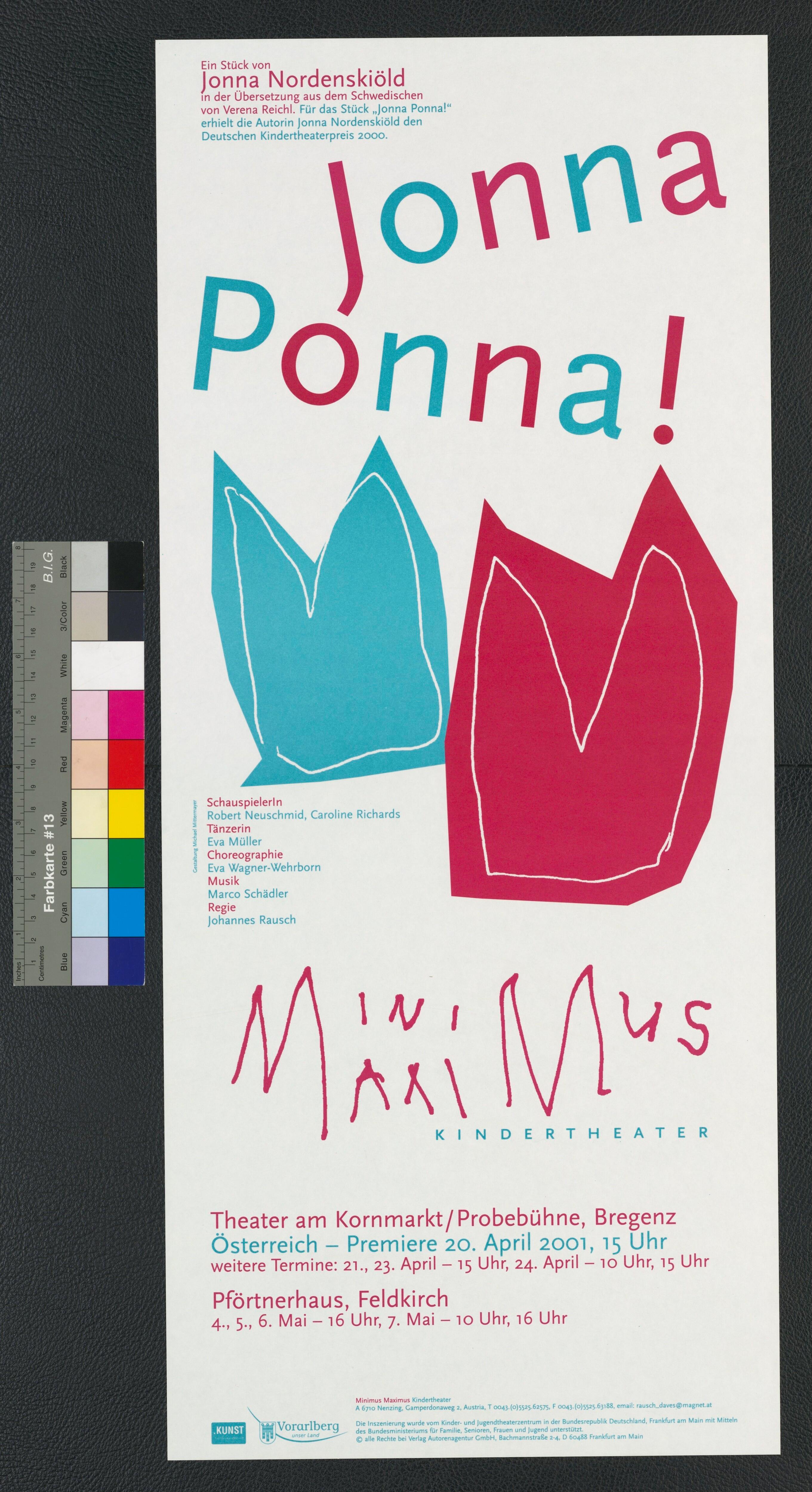• Originaltext: Jonna Ponna, Ein Stück von Jonna Nordenskiöld in der Übersetzung aus dem Schwedischen von Verena Reichl; Minimus/Maximus Kindertheater, 20.4.2001-7.5.2001 Feldkirch und Bregenz