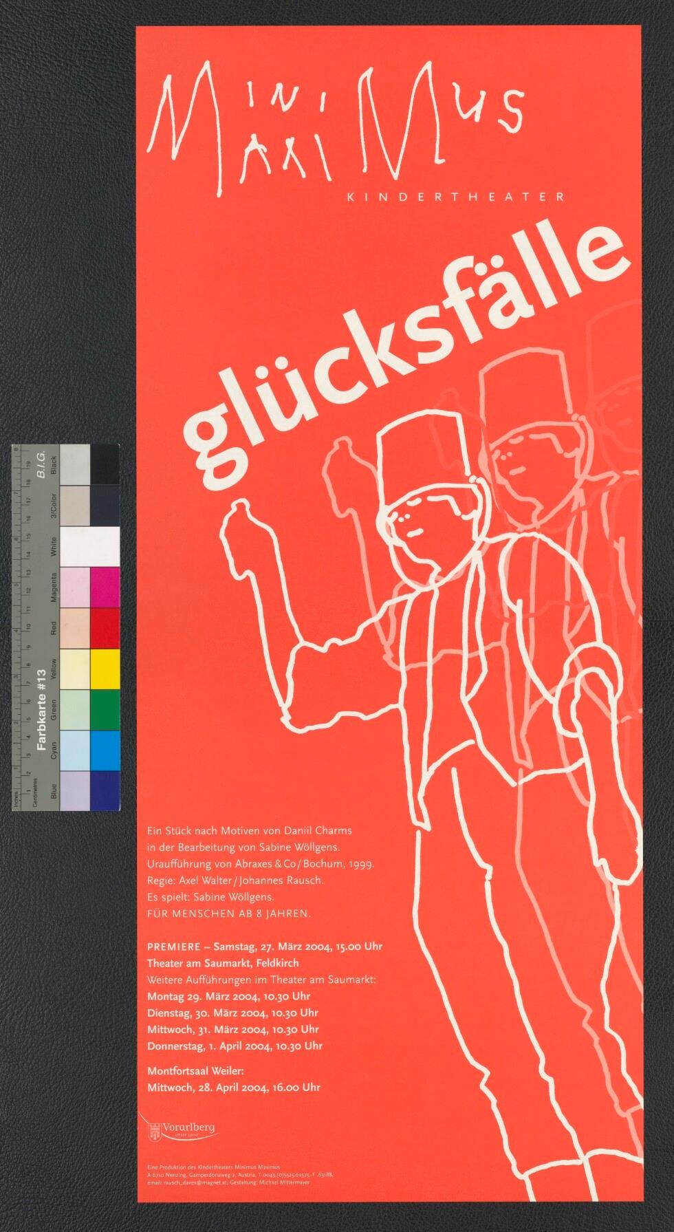 • Originaltext: Glücksfälle, ein Stück nach Motiven von Daniil Charms in der Bearbeitung von Sabine Wöllgens; Minimus/Maximus Kindertheater; 27.3.-28.4.2004, Feldkirch und Weiler