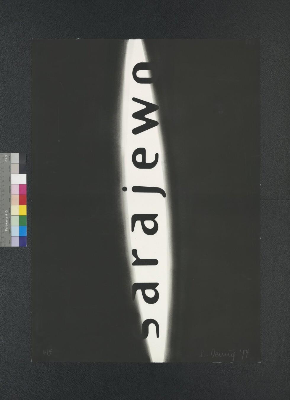 • Druck des schwarzen Schriftzuges 'sarajewo' auf weißem Papier, welches schwarz gestaltet wurde, bis auf den Schriftzug, der oval ausgelassen wurde (evt. als Lichtblick)