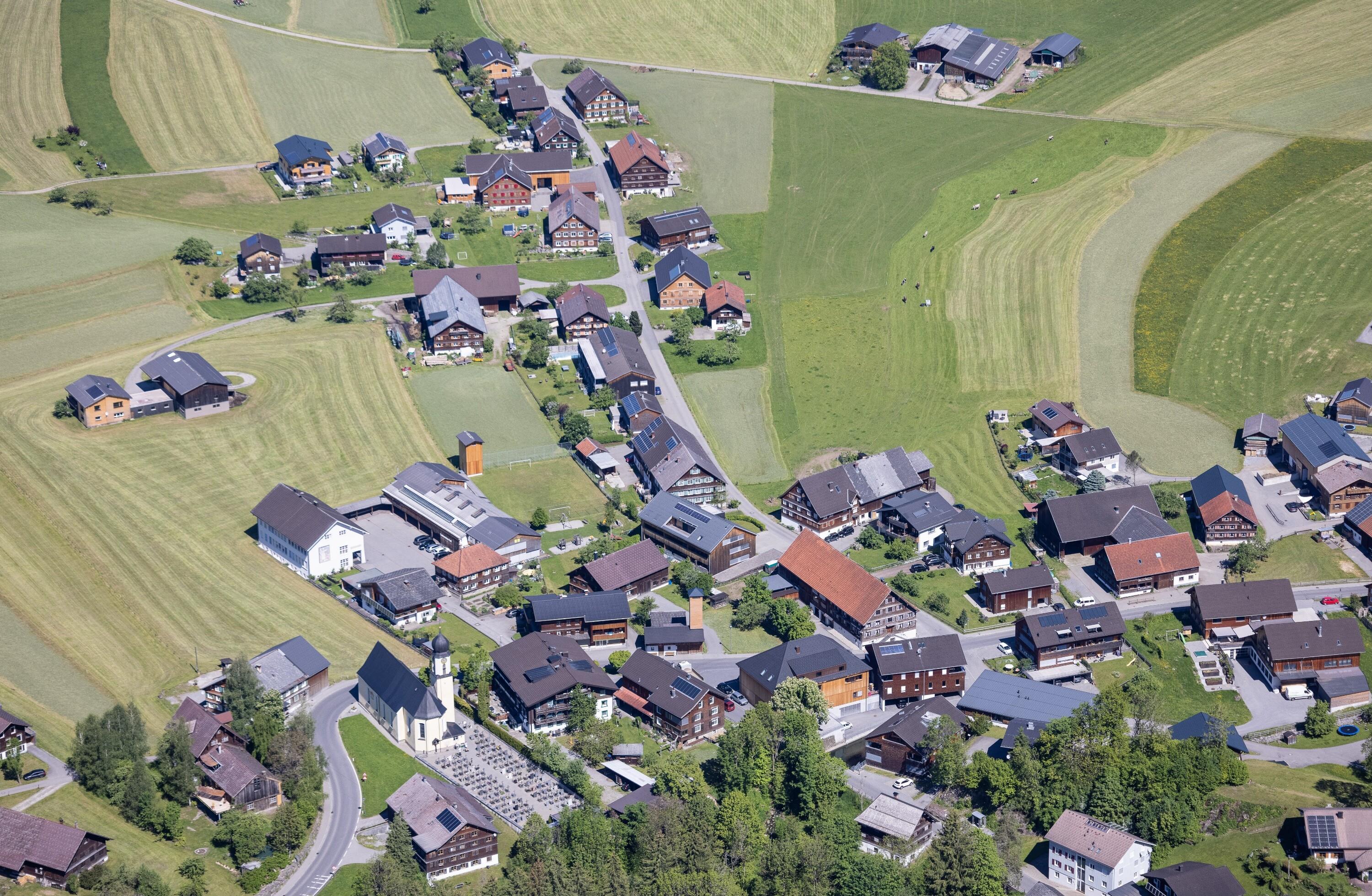 Schrägluftaufnahmen von Gebäuden der Gemeinde Egg, Großdorf
