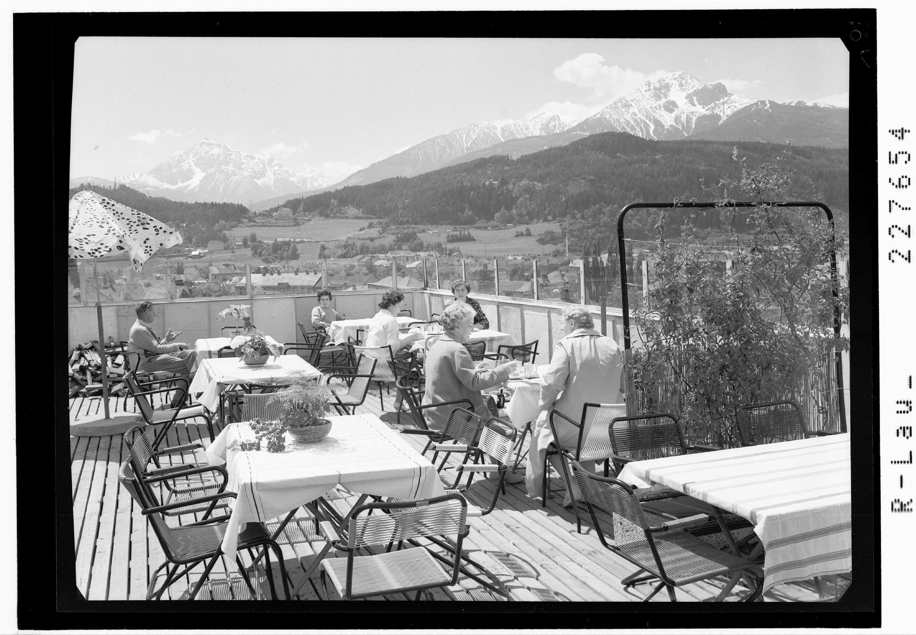 [Innsbruck / Hochhaus Cafe - Terrasse gegen Serles und Nockspitze / Tirol]