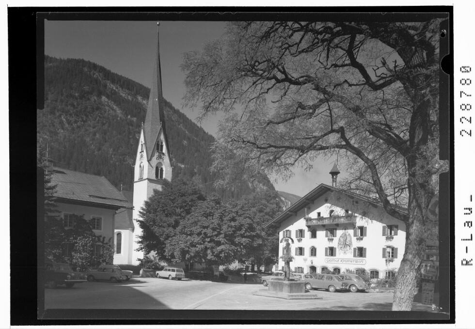[Mayrhofen im Zillertal / Dorfplatz mit Gasthof Kramerwirt und Pfarrkirche / Tirol]