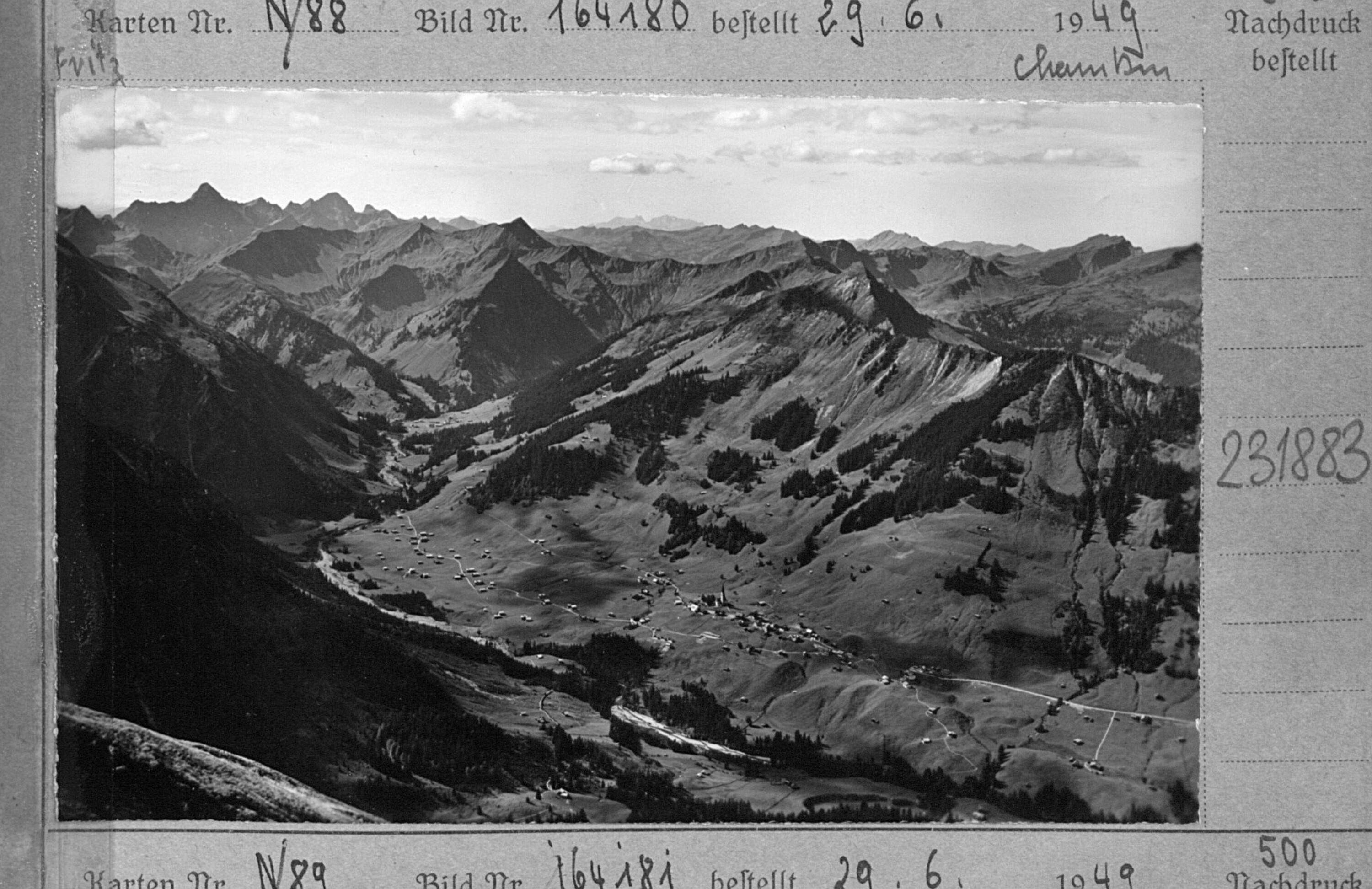 [Blick auf Mittelberg im Kleinwalsertal gegen Künzelspitze, Zitterklapfen, Üntschenspitze, Grünhorn, Kanisfluh und Diedamskopf]