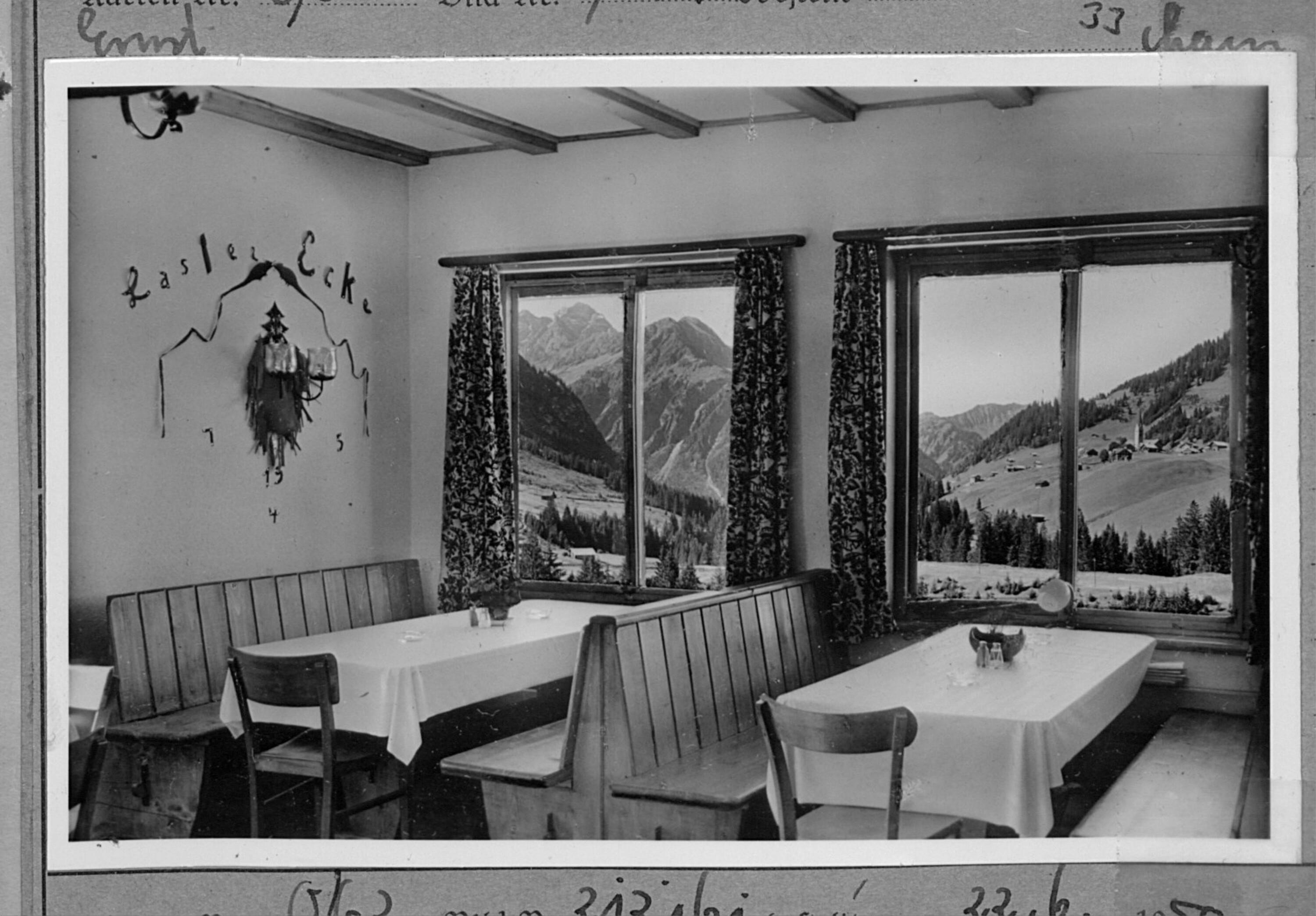 [Gastraum im Alpengasthof Wildental bei Mittelberg mit Ausblick zum Widderstein / Kleinwalsertal]